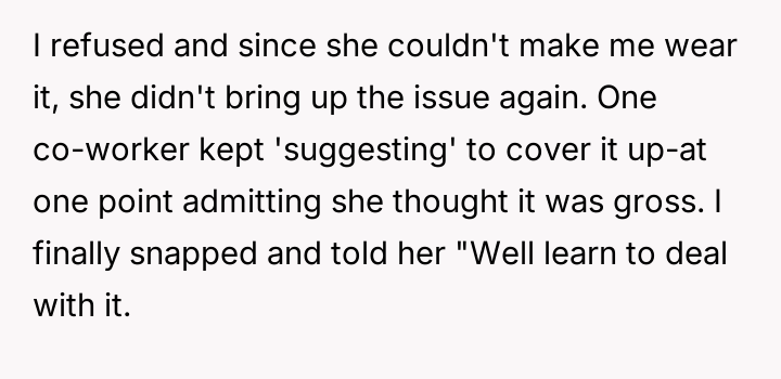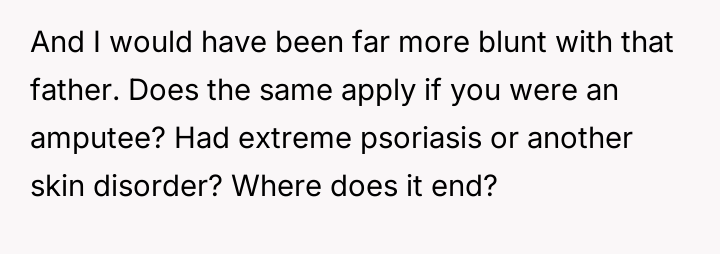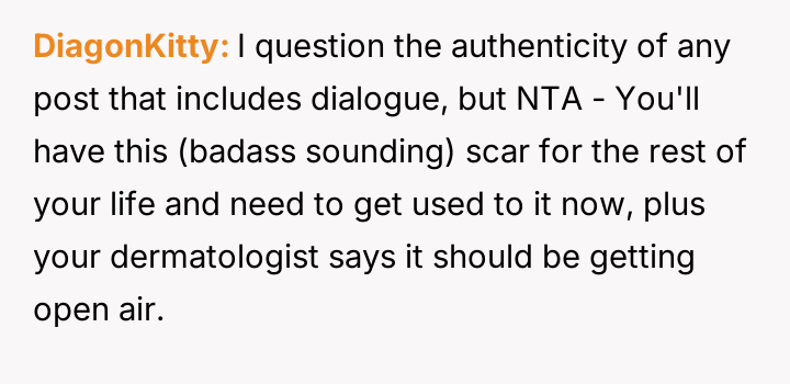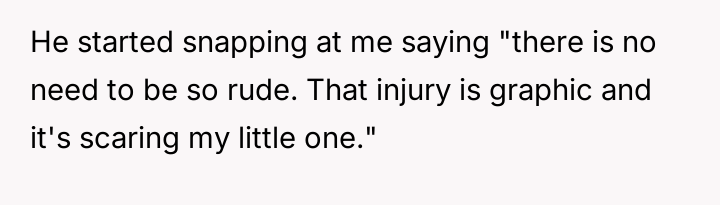 Given the permanent nature of the scar, the professional medical advice received, and the public setting of the confrontation, was the OP justified in refusing to cover their injury and in their confrontational response, or should they have prioritized maintaining civility and accommodating the request of the child's parent?