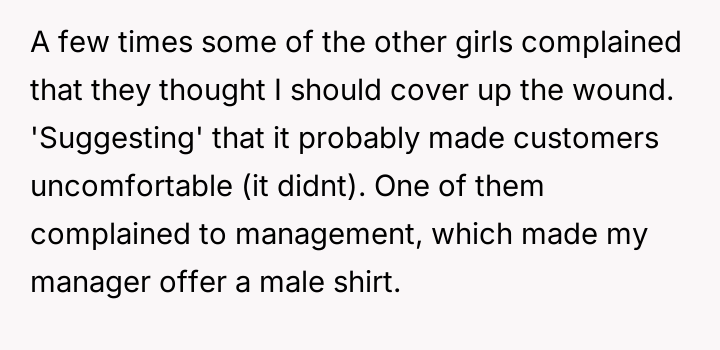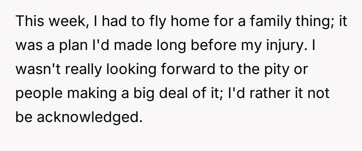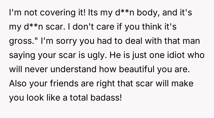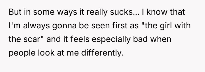 While friends offer supportive reassurance focused on resilience, the OP struggles with the reality of being permanently defined by the injury and facing unwanted attention, especially pity.