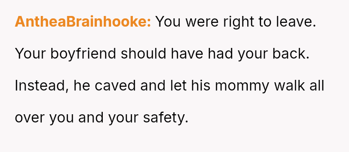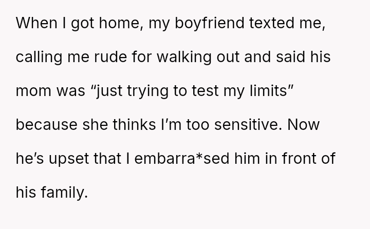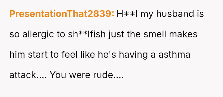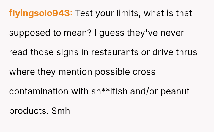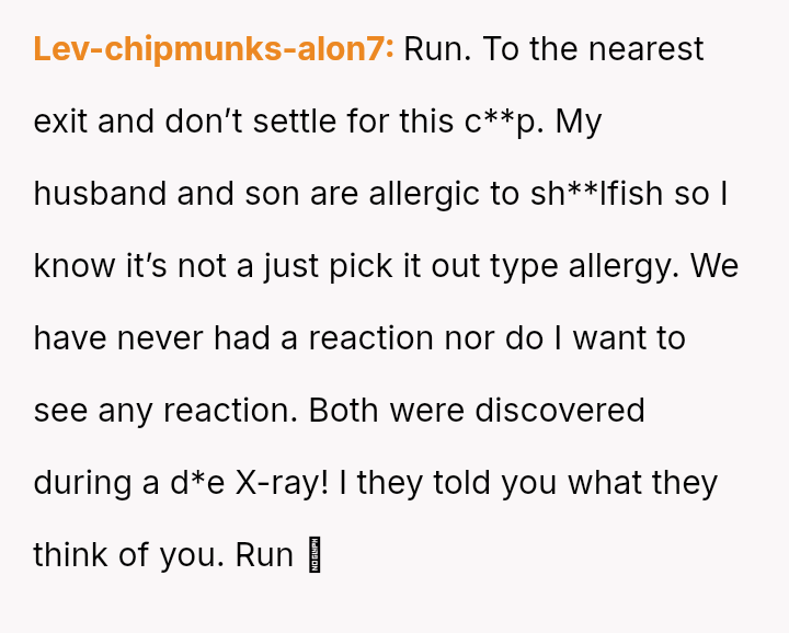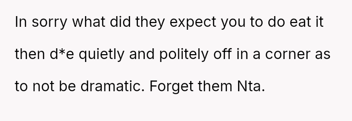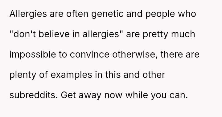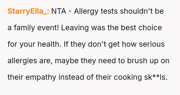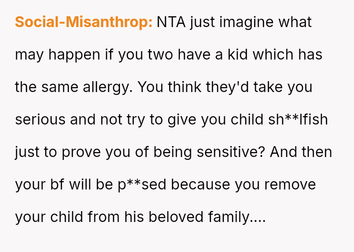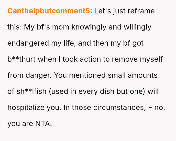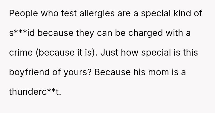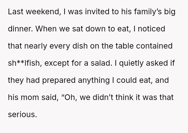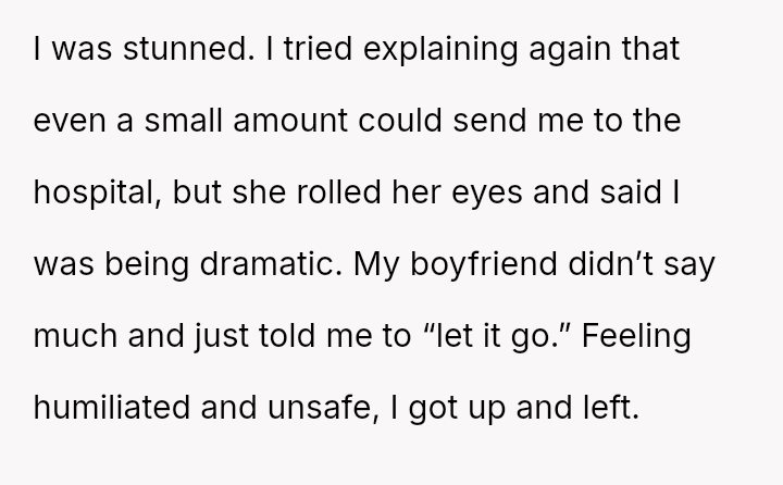 When she quietly asked for an alternative, the boyfriend's mother dismissed her allergy, suggesting she just "pick it out." After attempting to explain the danger again, the mother grew dismissive, leading the user to leave the event feeling unsafe and humiliated, causing her boyfriend to later accuse her of being rude.