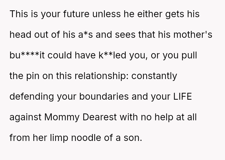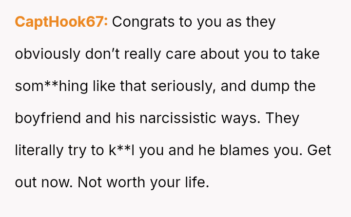 Her actions were driven by fear for her health, while her boyfriend and his mother prioritized social comfort and minimized the severity of her medical condition.