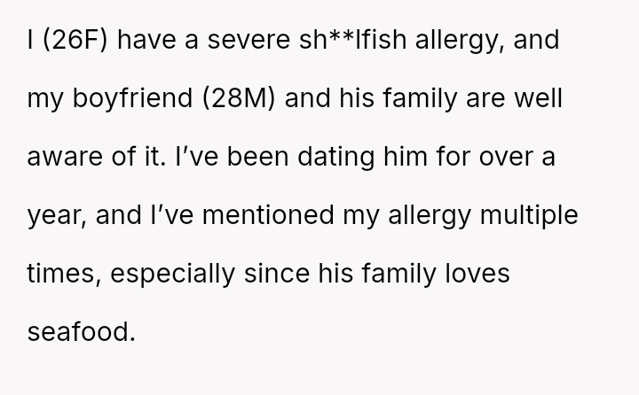 The user, a 26-year-old female, has a severe sh**lfish allergy which her 28-year-old boyfriend and his family are aware of.