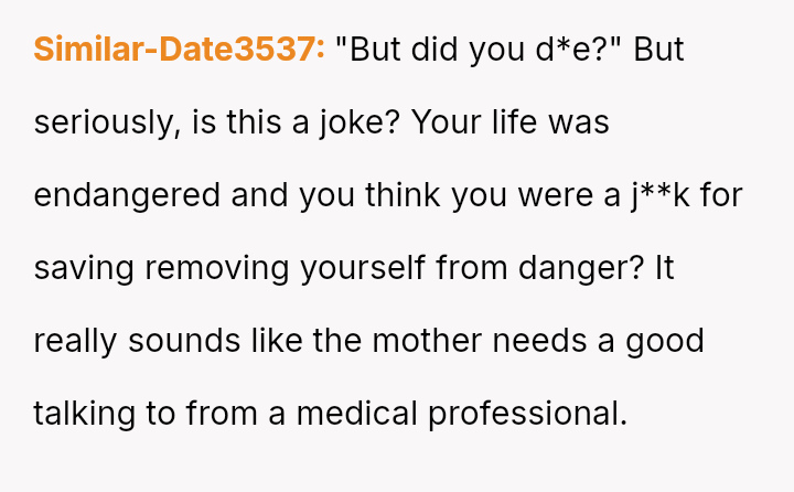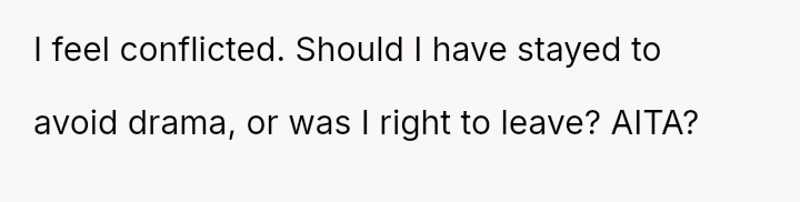 The central question is whether prioritizing immediate physical safety by leaving a dangerous environment justifies the resulting social drama, or if accommodating the host's expectations, even when medically risky, is the required action in a family setting? Readers must consider the validity of self-preservation versus maintaining relationship harmony.