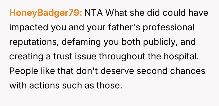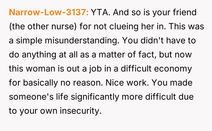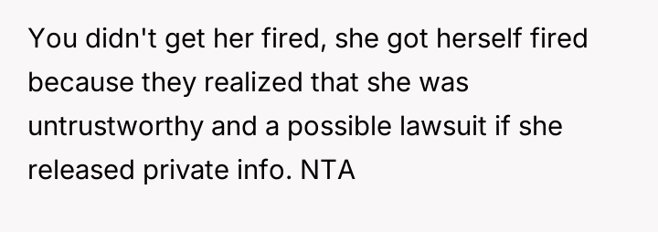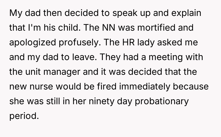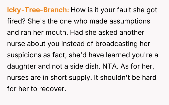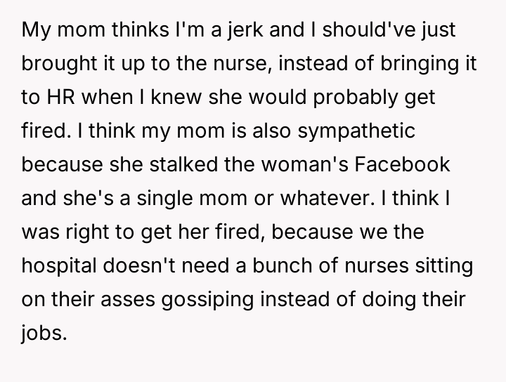 Her mother, however, feels the OP acted too harshly, suggesting direct communication would have been better and pointing out the hardship faced by the now-terminated nurse, who is a single mother.