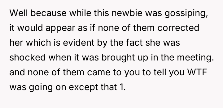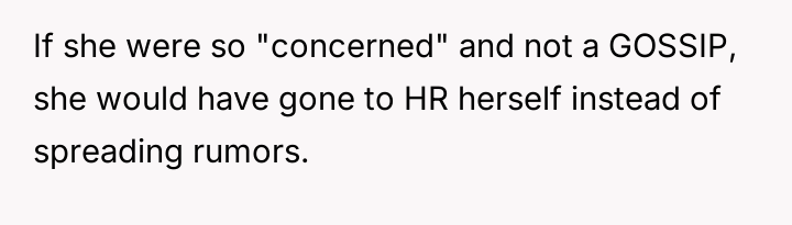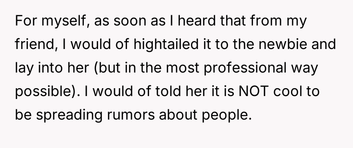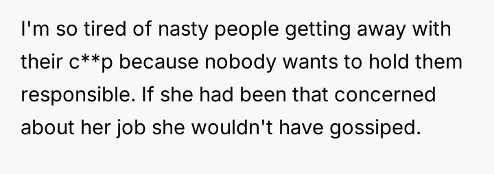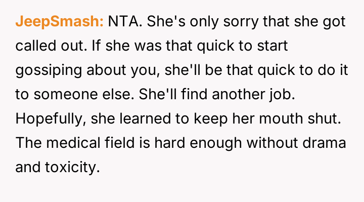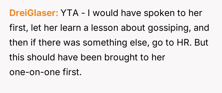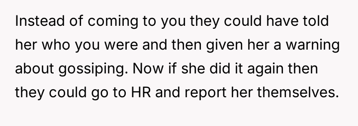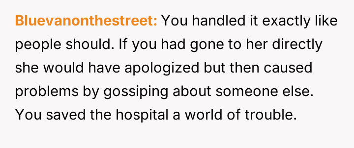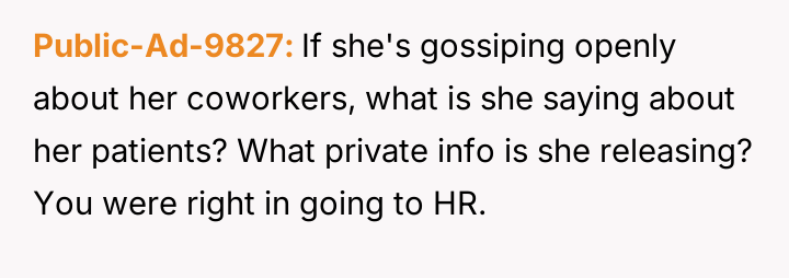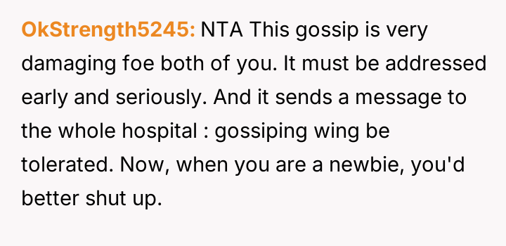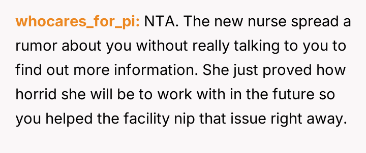 The OP, angered by the gossip, bypassed addressing the issue directly with the nurse and instead escalated the matter immediately to Human Resources, leading to an investigation and the subsequent termination of the new nurse.