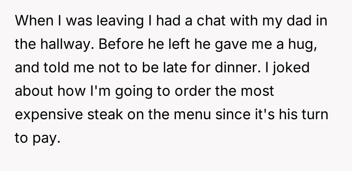 The conflict began when the OP and her father shared a brief, affectionate farewell, including a hug, in the hallway near the nurses' station.