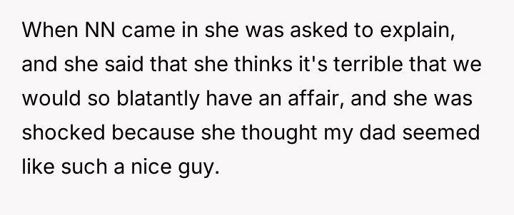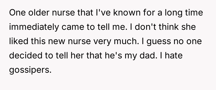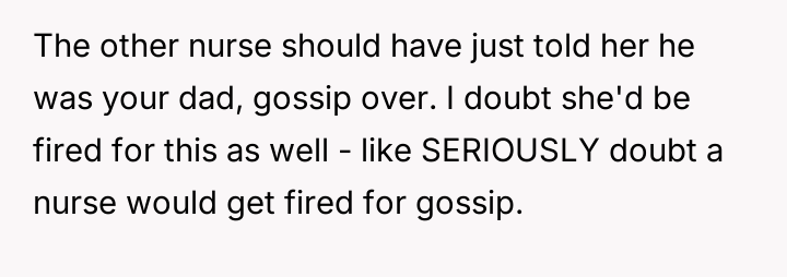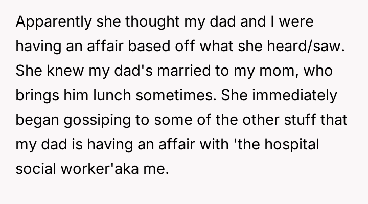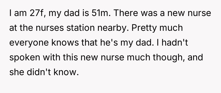 A new nurse nearby misinterpreted this interaction, assuming the OP and her father were romantically involved. This new nurse then spread this rumor to other staff members.