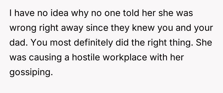 The OP is standing by her belief that reporting the severe workplace gossip to HR was necessary to maintain professional standards, despite the fact that the gossip originated from a misunderstanding about her relationship with her father.