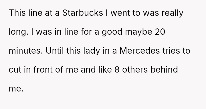 In the quiet frustration of a slow-moving Starbucks line, patience wore thin as a woman in a Mercedes brazenly cut ahead, shattering the unspoken code of respect shared by those waiting.