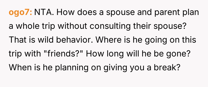 The central conflict arises from the husband prioritizing his uncommunicated desire for a personal break over the shared commitment and mutual decision-making expected in their marriage, leading the OP to react emotionally to this perceived exclusion and lack of consideration.