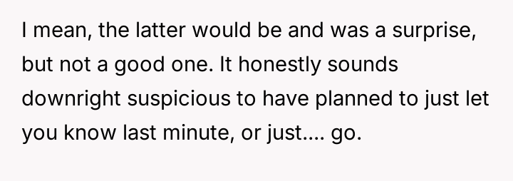 The original poster (OP) is experiencing significant feelings of shock, betrayal, and disrespect after discovering her husband secretly planned a solo New Year's Eve trip with friends, contrary to their established family tradition.