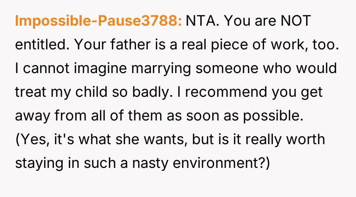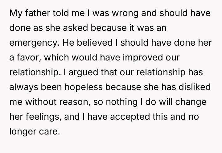 When an emergency strikes, should a stepchild be expected to immediately set aside prior grievances and fulfill a demanding request from a hostile household member, or does the ongoing mistreatment nullify any obligation to provide assistance, even under duress?