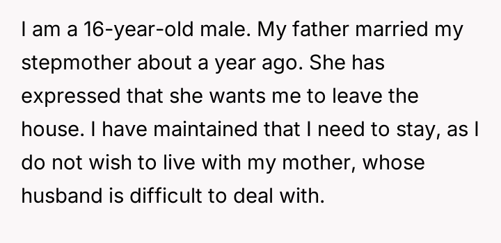 A sixteen-year-old boy finds himself trapped in a home where love and acceptance feel out of reach. His stepmother's cold rejection and harsh rules create an invisible barrier, forcing him to fend for himself in a place that should be a sanctuary.