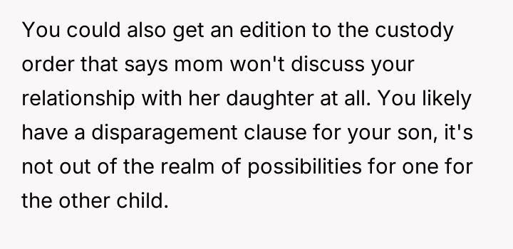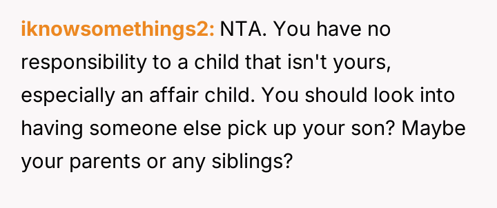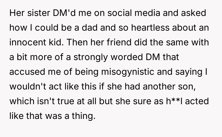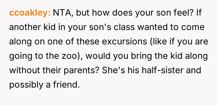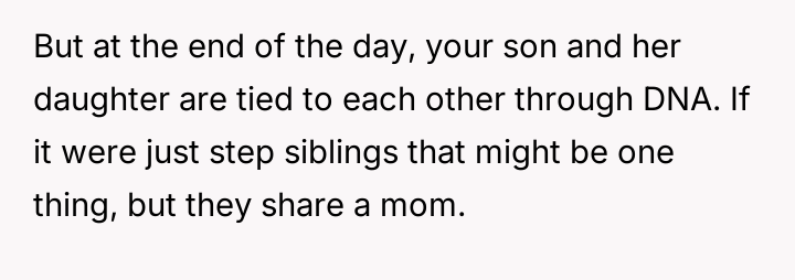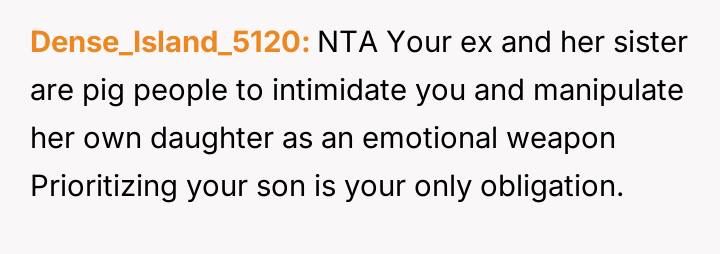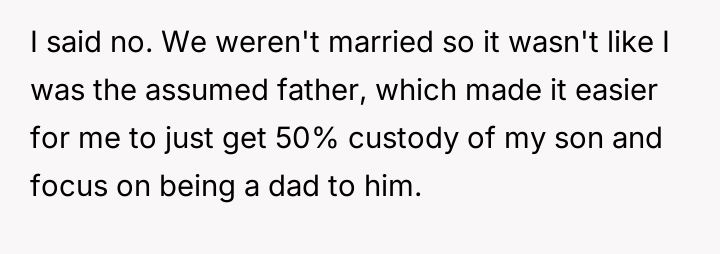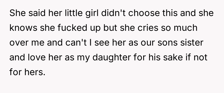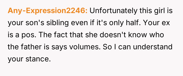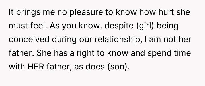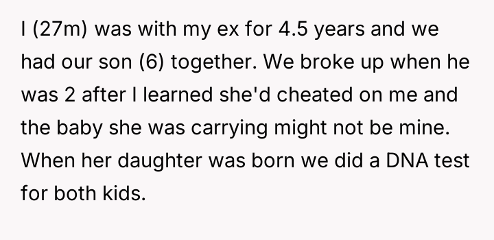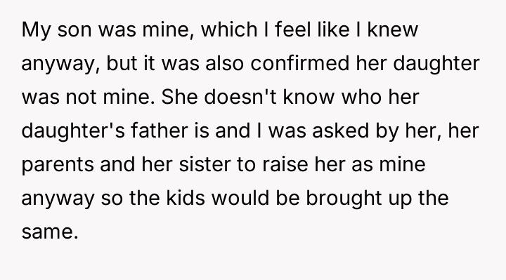 Despite this, the ex-partner, her parents, and her sister asked the user to raise the daughter as his own so the children could grow up together. The user refused, prioritizing his role as the father to his biological son and establishing 50% custody.