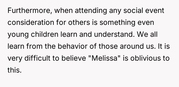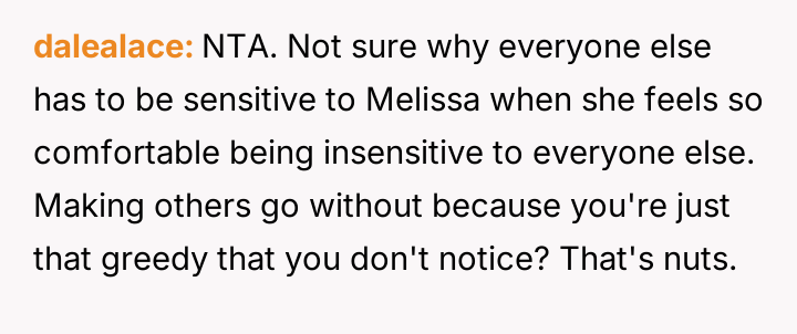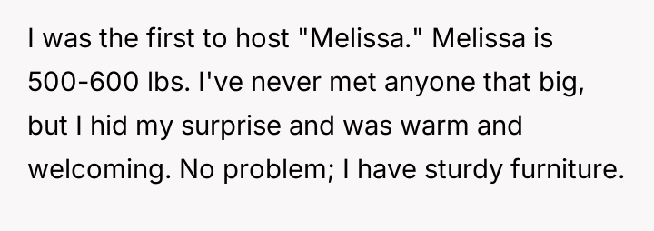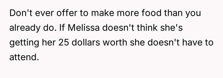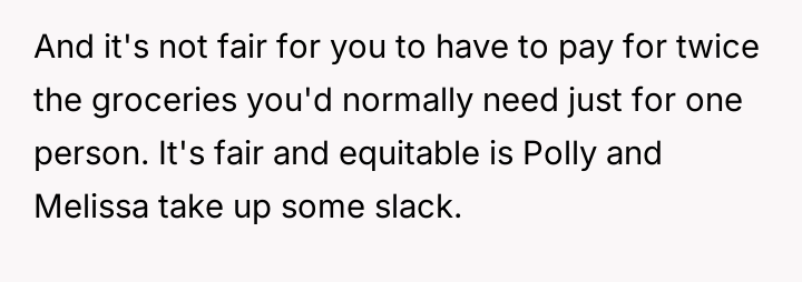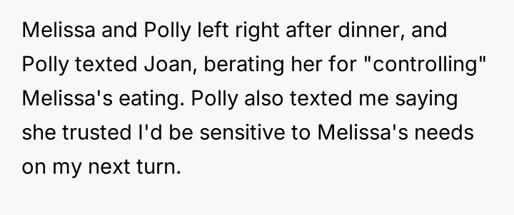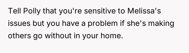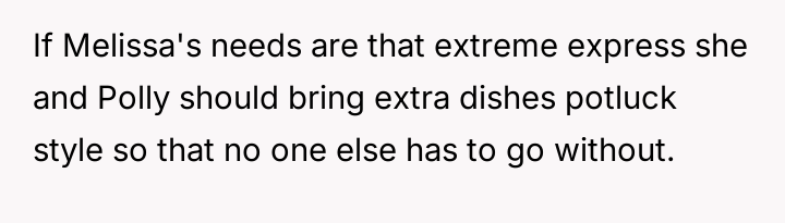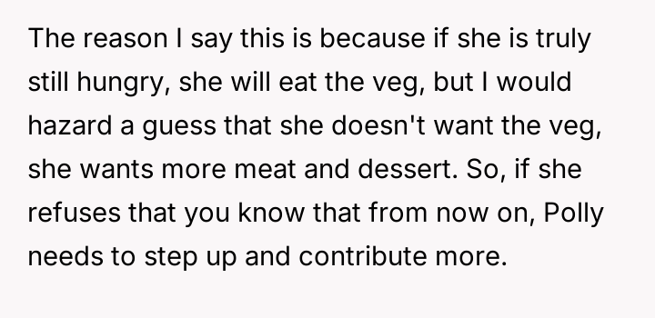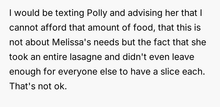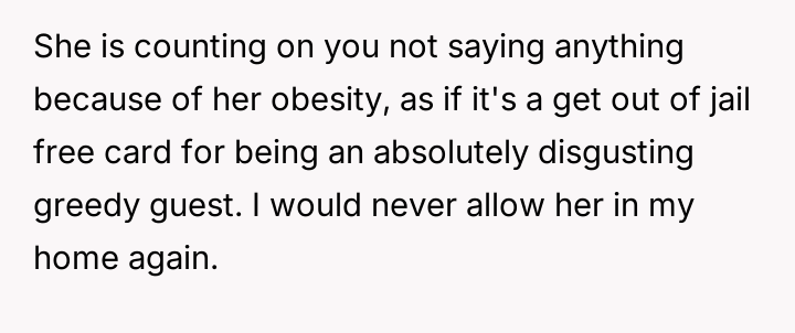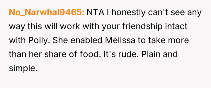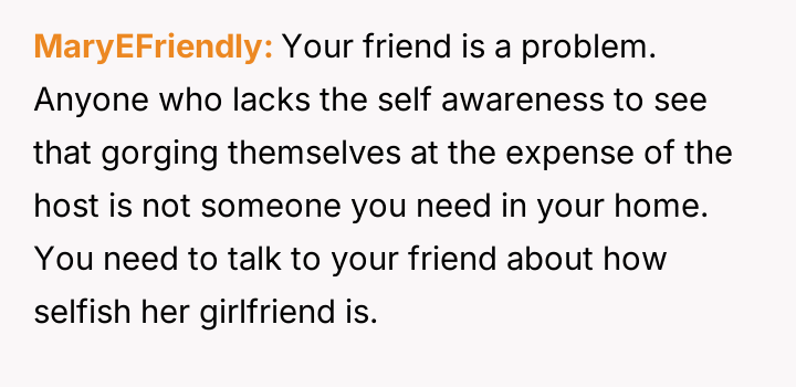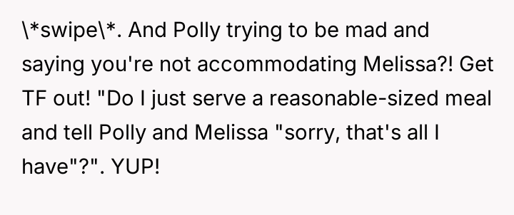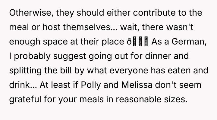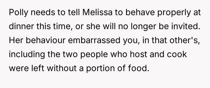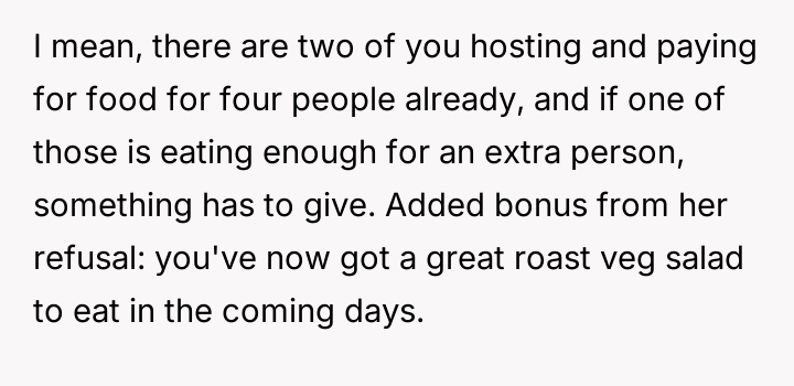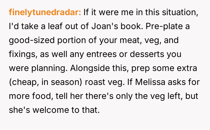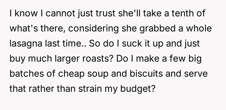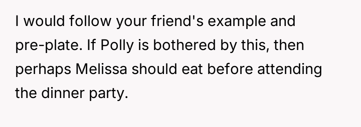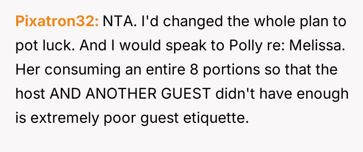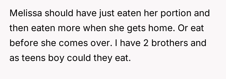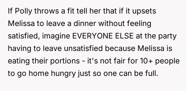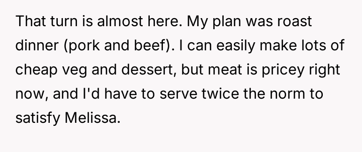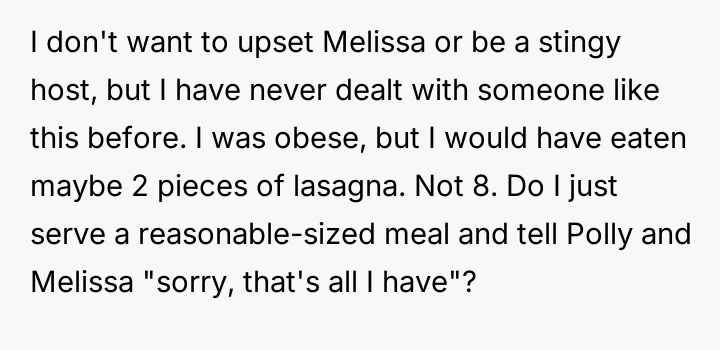 When the OP hosts again soon, concerned about the high cost of preparing enough food to accommodate Melissa's apparent appetite, the OP is now unsure how to balance being a good host with managing extreme food consumption and budgetary constraints, leading to the central dilemma.