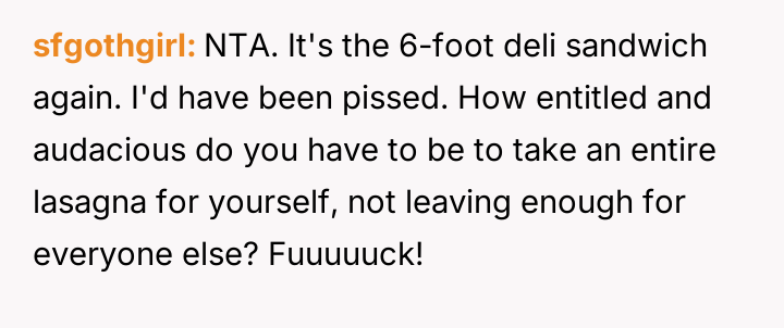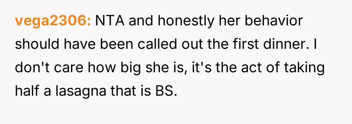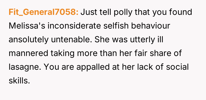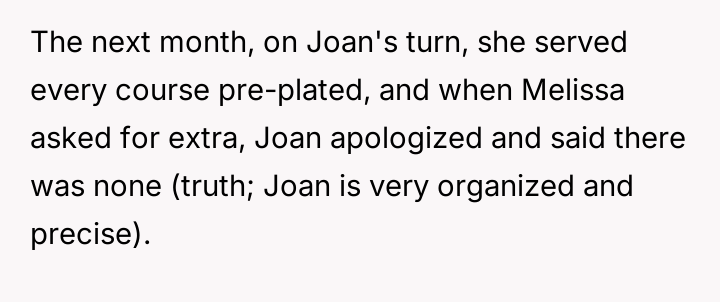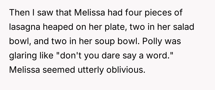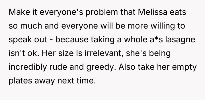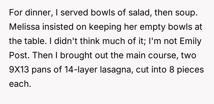 During the OP's turn to host, Melissa, who is significantly larger than the other guests, took an unusually large amount of the main course, lasagna, by filling her serving bowls and extra soup/salad bowls.