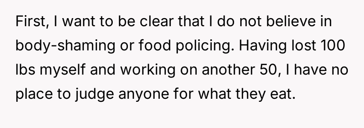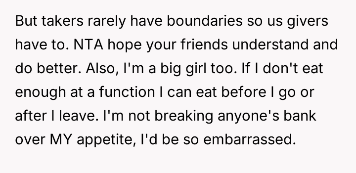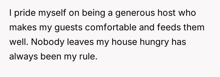 The original poster (OP), who has personal experience with weight loss, prides themselves on being a generous host who ensures no guest leaves hungry.