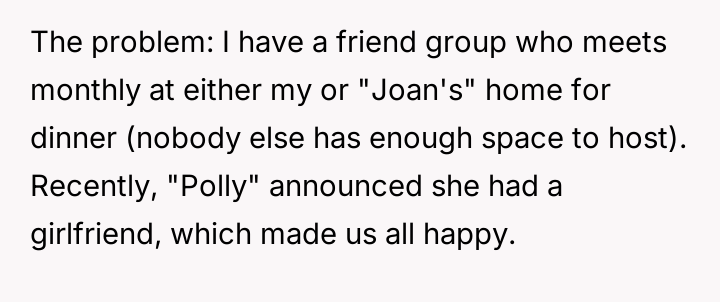 This standard has been challenged by the introduction of a new person, Melissa, into the monthly dinner friend group.