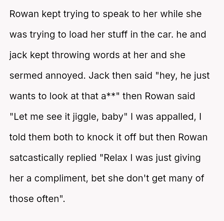 What should have been a night of happiness took a sharp turn as Rowan and his friend Jack’s crude behavior shattered the calm, exposing a side of Rowan that no one anticipated. Caught in the unsettling exchange, the narrator was left grappling with shock and disappointment.