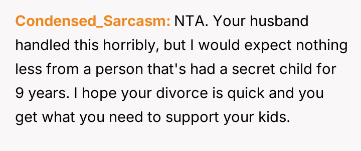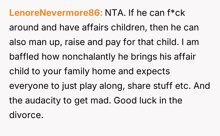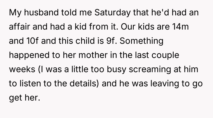 The Original Poster (OP) acted decisively to protect her existing family's comfort and boundaries upon learning of her husband's infidelity and the introduction of his previously hidden child into their home.
