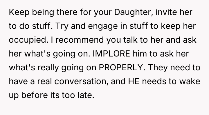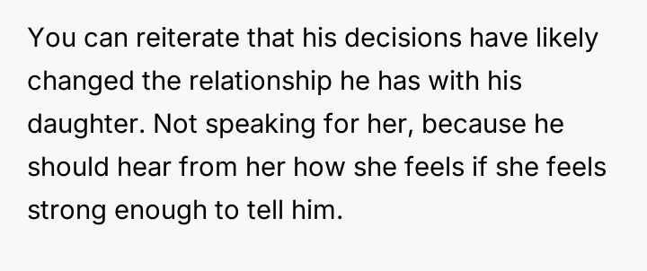 Readers must consider where the primary responsibility for mending the father-daughter relationship lies in this scenario.