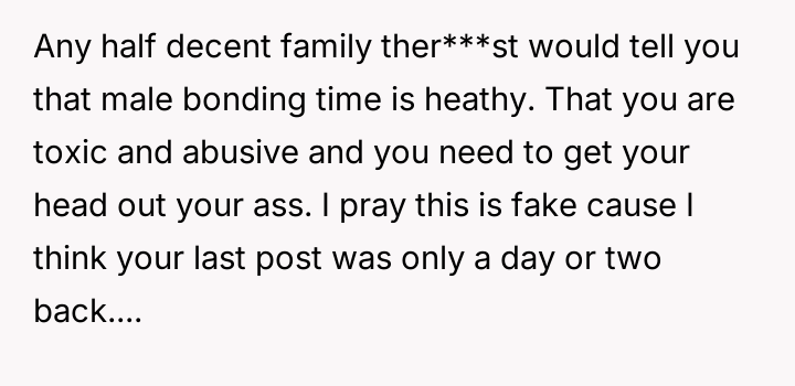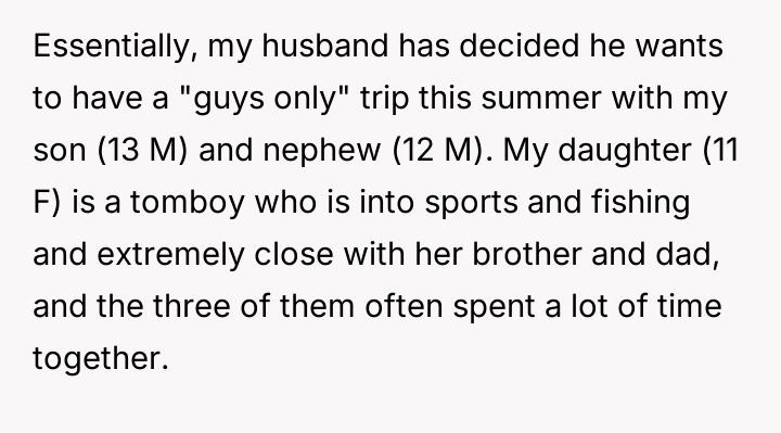 The OP's daughter (11F), who is very close to her father and brother, enjoys similar activities like sports and fishing, and was excluded from this trip by the husband's request for time without women present.