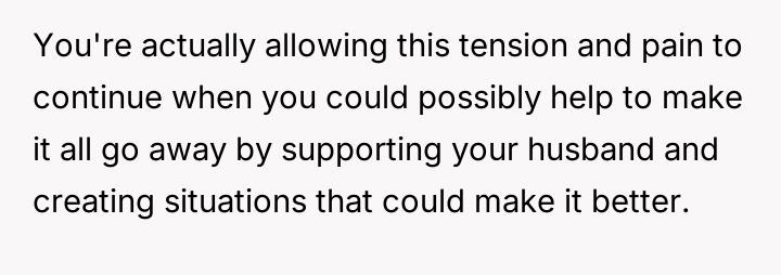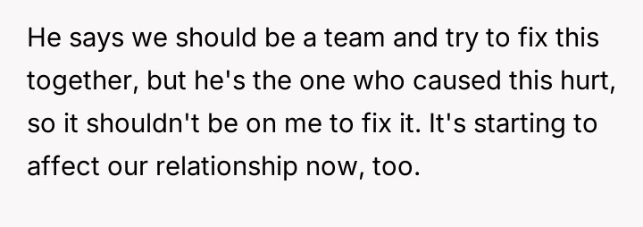 The OP feels the husband must take full accountability for the hurt he caused, while the husband seeks shared responsibility for repairing the resulting family distance, thereby straining the marital relationship.