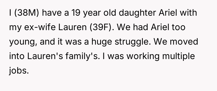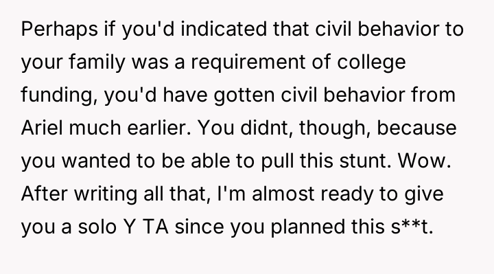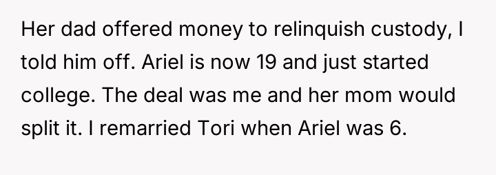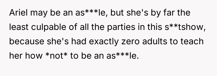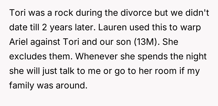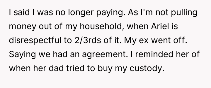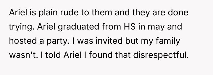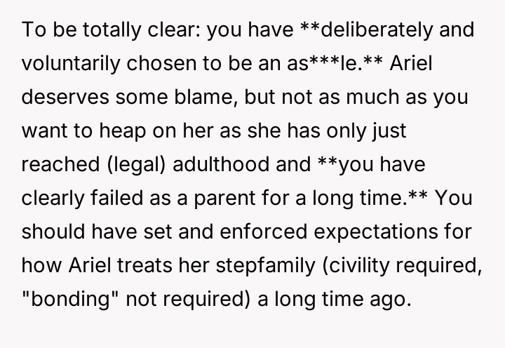 The original poster (OP) has reached a breaking point regarding his daughter Ariel's long-standing disrespectful behavior towards him and his current family, which he attributes to influence from his ex-wife.