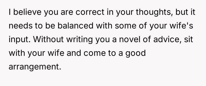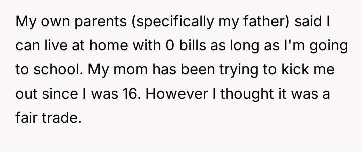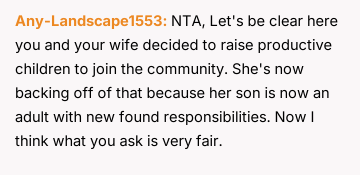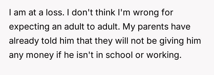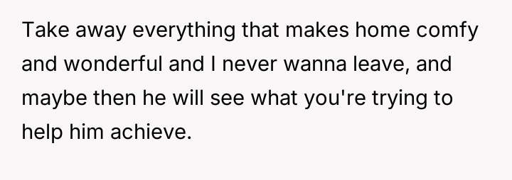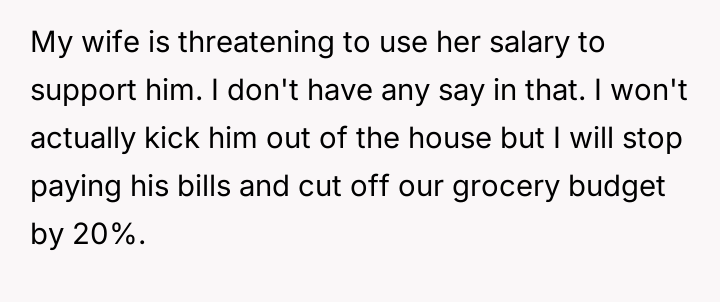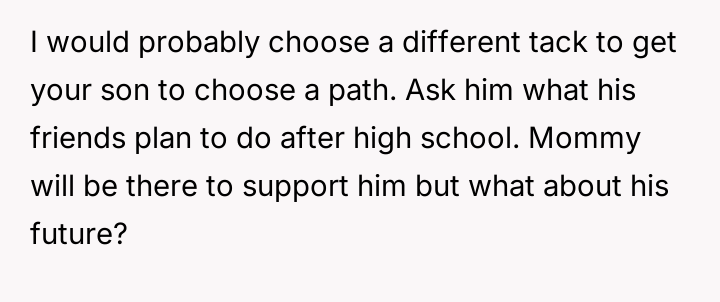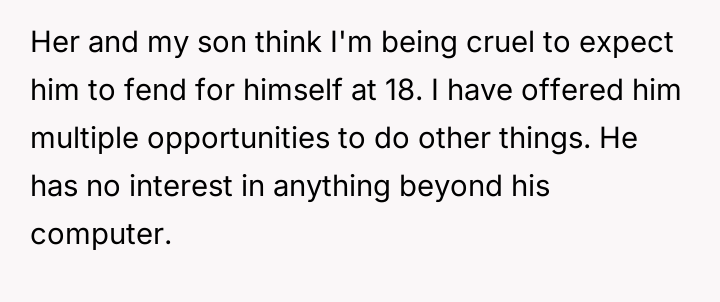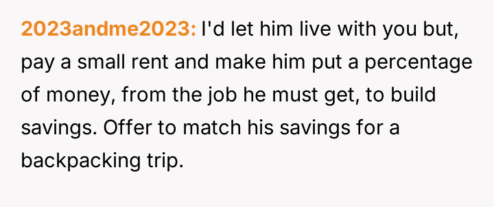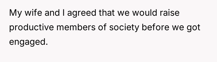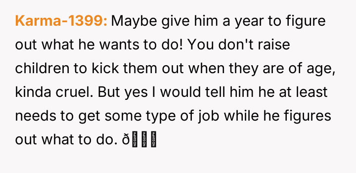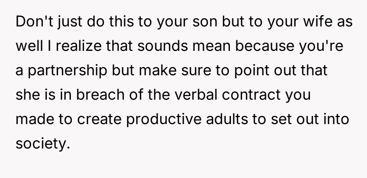 Is the father correct in enforcing a strict 'work or school or leave' ultimatum on his adult-age son, based on his personal history and an earlier agreement with his wife, or is the mother correct in advocating for continued support due to the family's financial security and the son's current lack of direction?