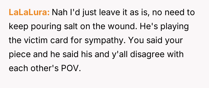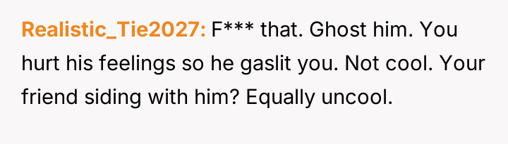 This refusal led to Ben aggressively questioning her decision, labeling her as judgmental, and claiming victimhood over his past circumstances, causing the OP significant distress and conflict with their mutual friends who are now pressuring her to apologize.