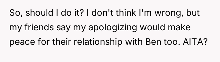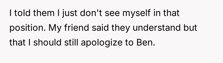 Should the OP apologize to placate the mutual friends, or does apologizing validate Ben's aggressive response to a stated preference?