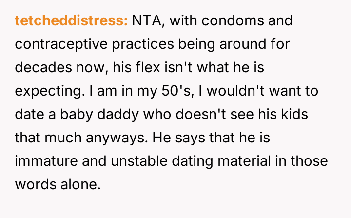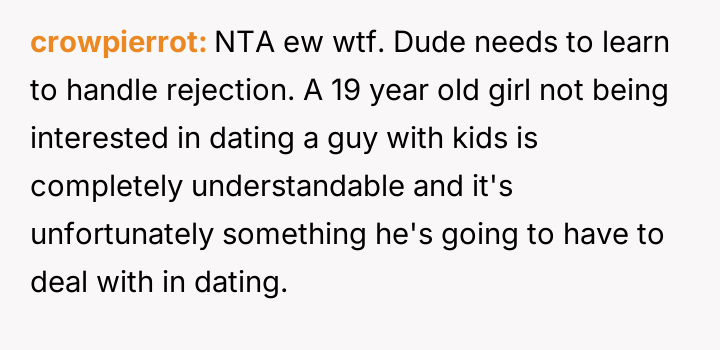Ben reacted defensively and inappropriately when his parental status was cited as the reason for rejection, while the OP now faces social repercussions for standing by her established dating preferences.