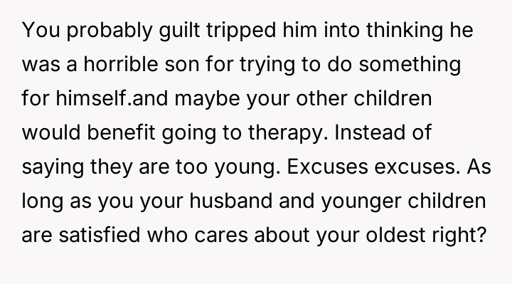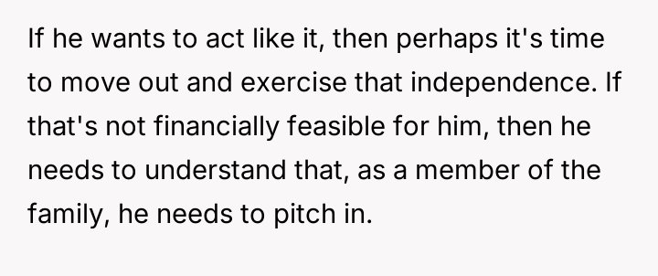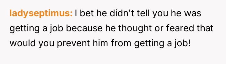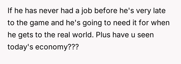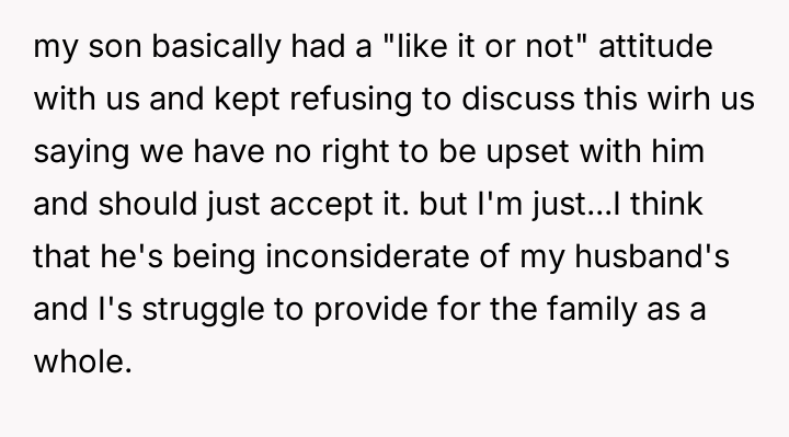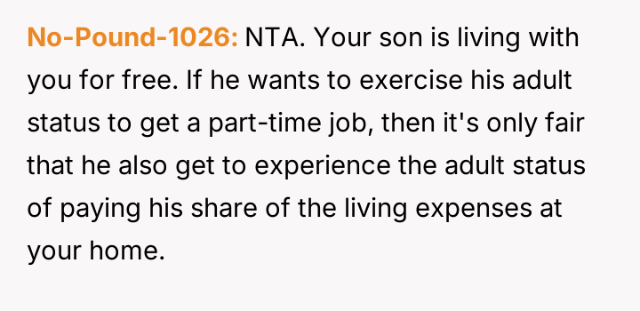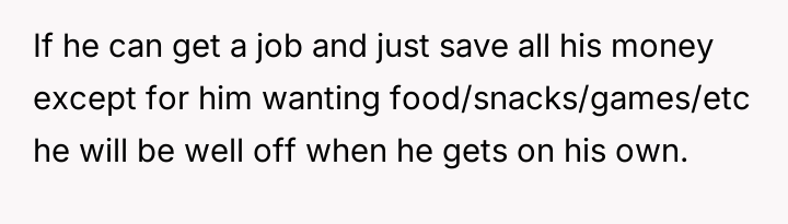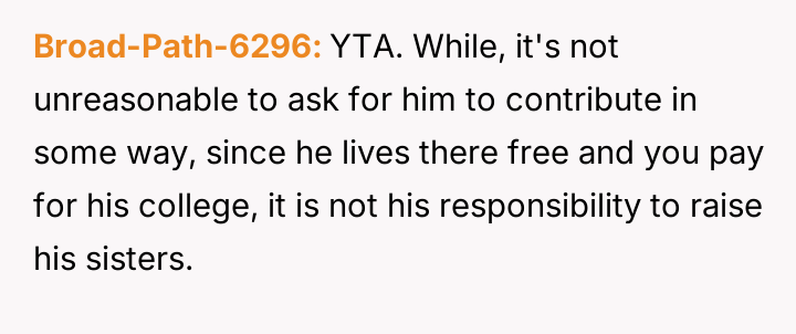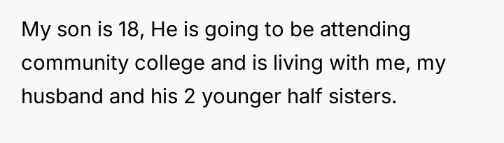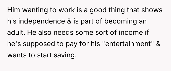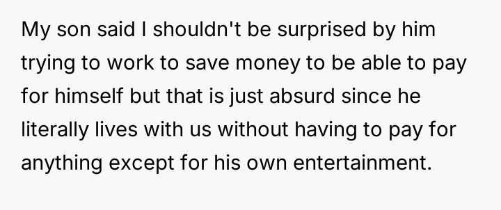 The core conflict lies in the OP and her husband expecting the son to continue fulfilling an unpaid caregiving role for his younger half-sisters, which directly clashes with the son's emerging adult desire for financial independence and self-sufficiency.