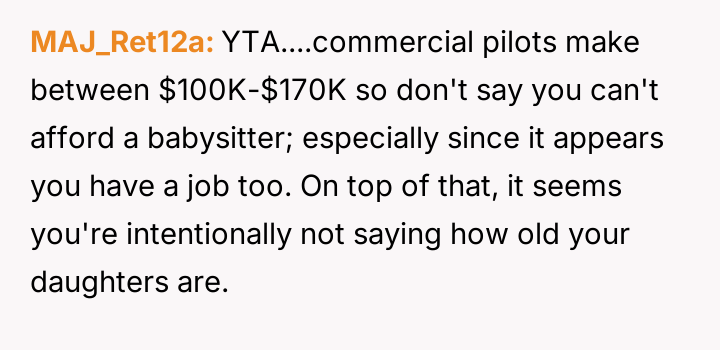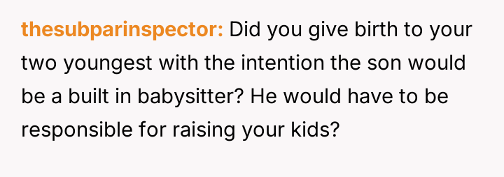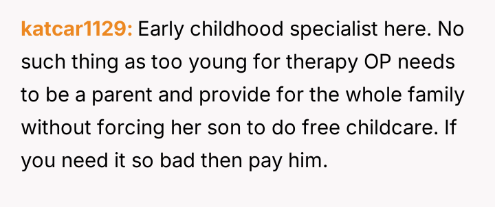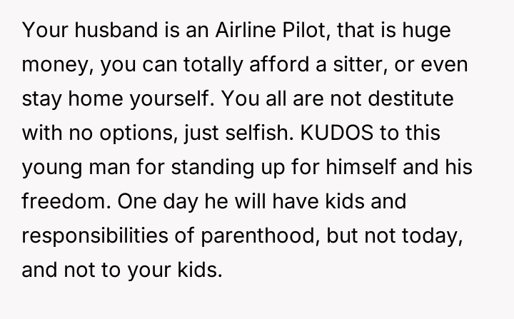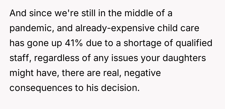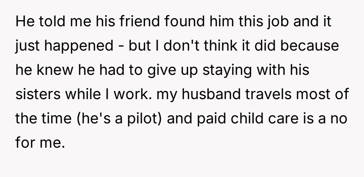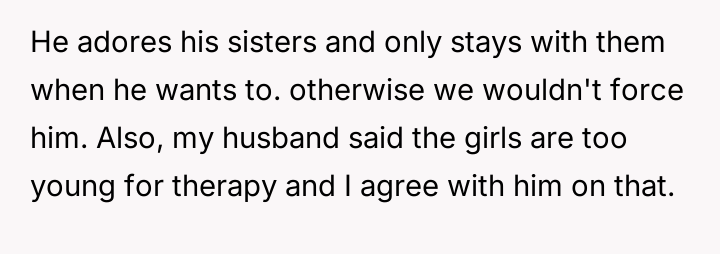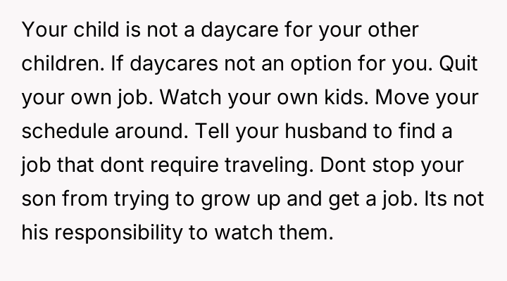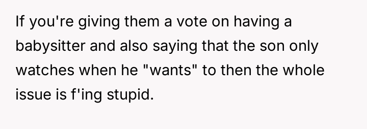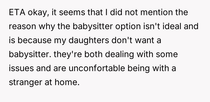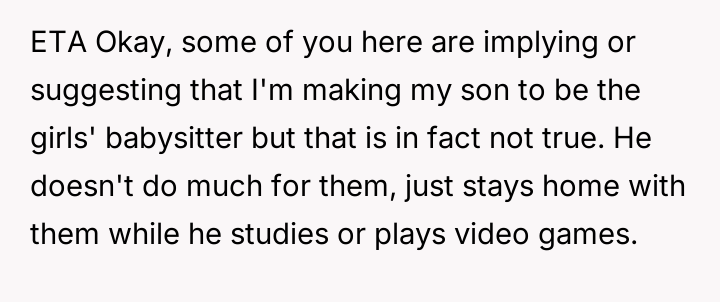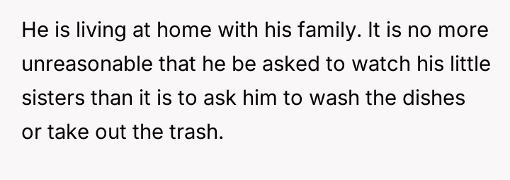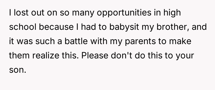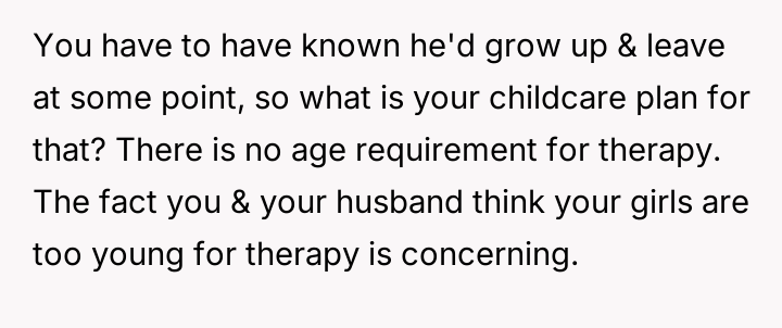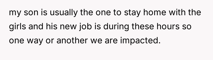 Given the son's valid need to earn money and the family's established reliance on him for childcare during critical hours, is the expectation that the son must prioritize unpaid family caregiving over his job, or should the parents immediately invest in professional childcare despite their financial concerns and the daughters' discomfort with strangers?