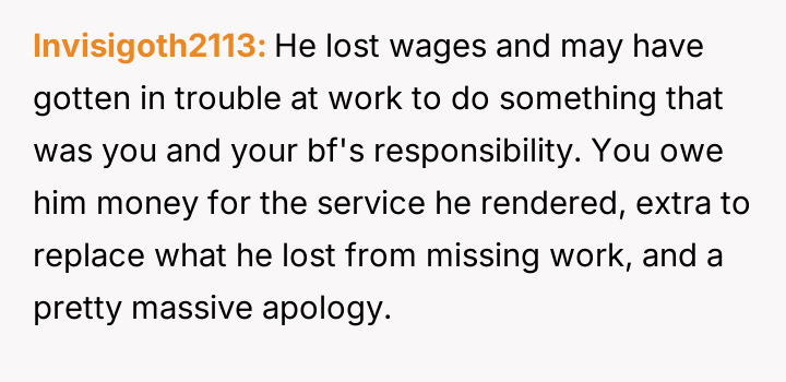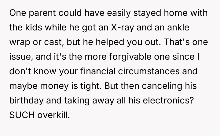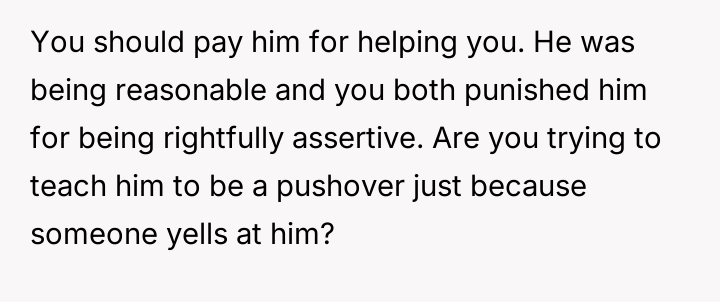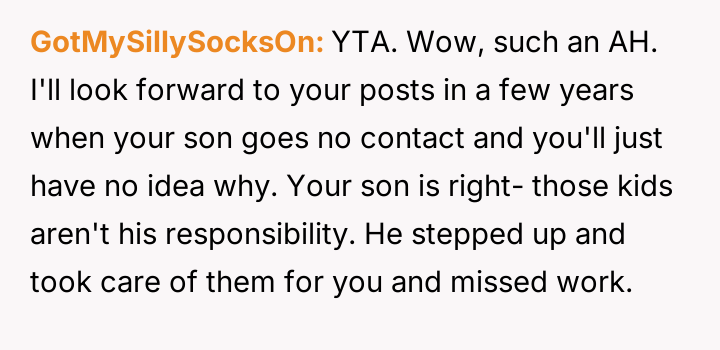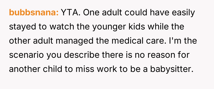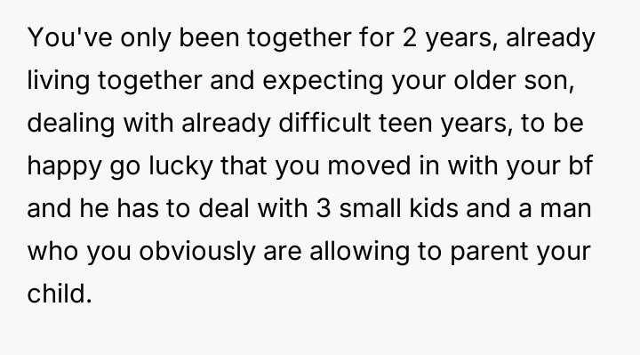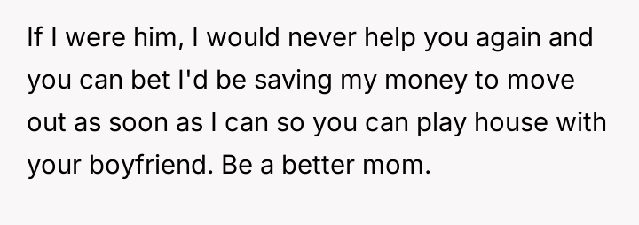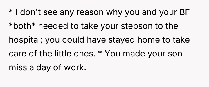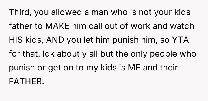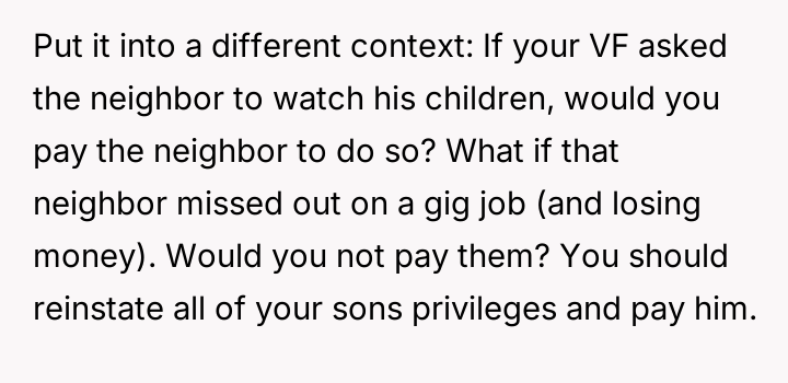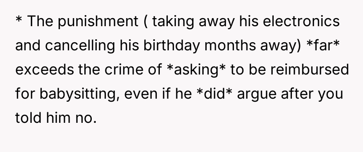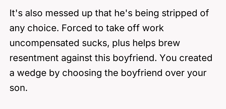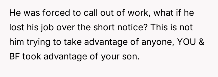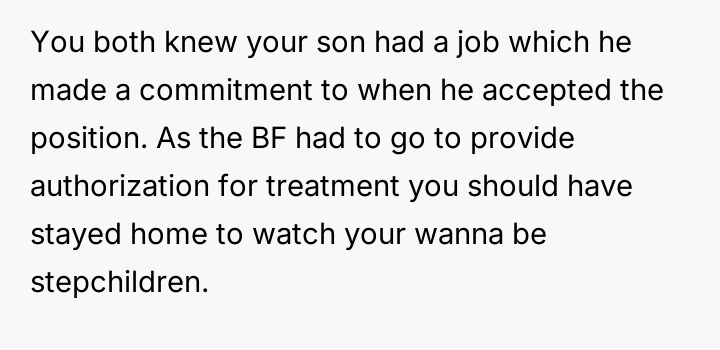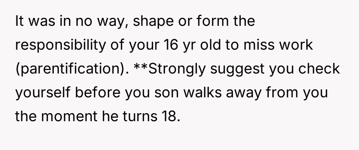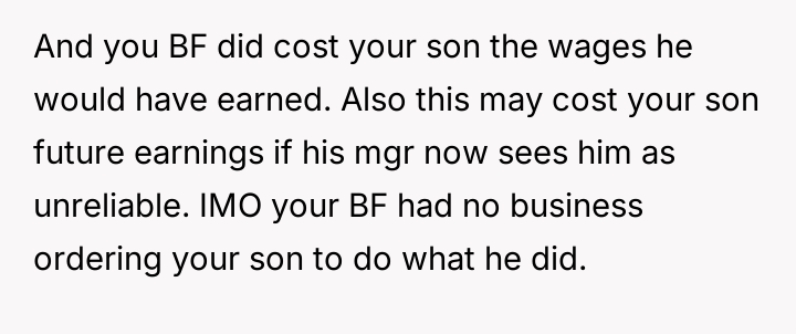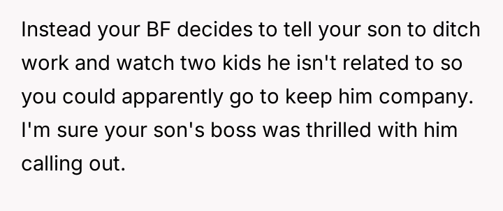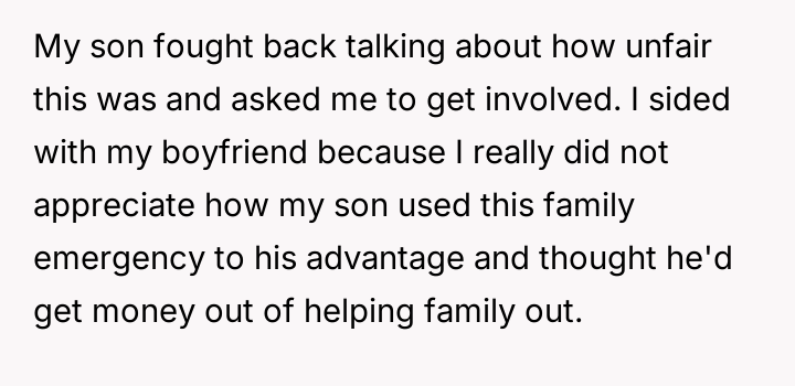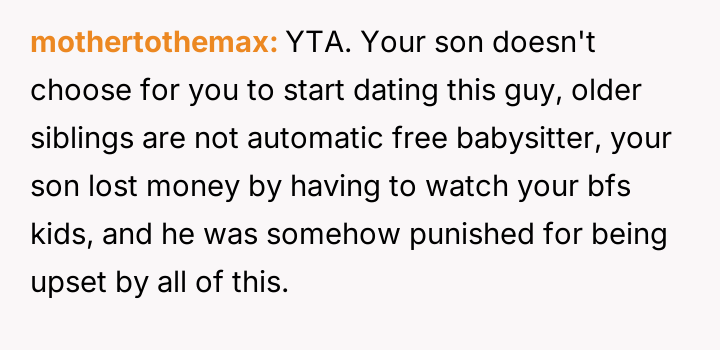 The original poster sided with her boyfriend against her 16-year-old son regarding payment for childcare during a family emergency.
