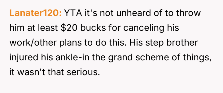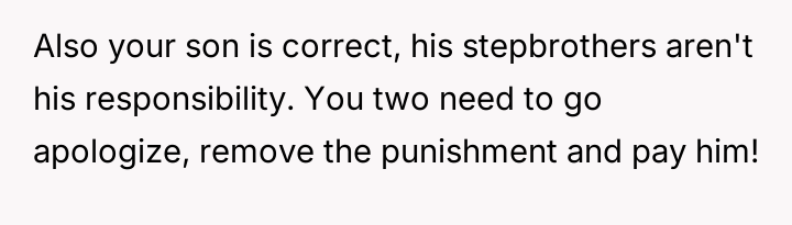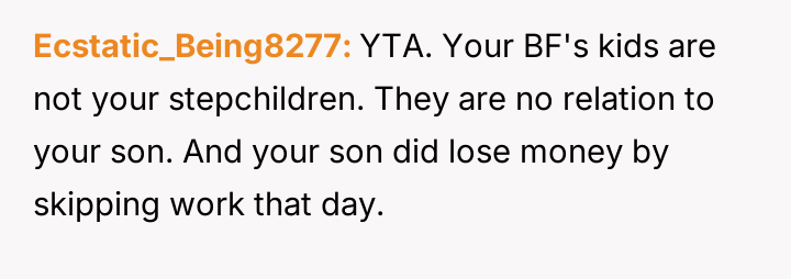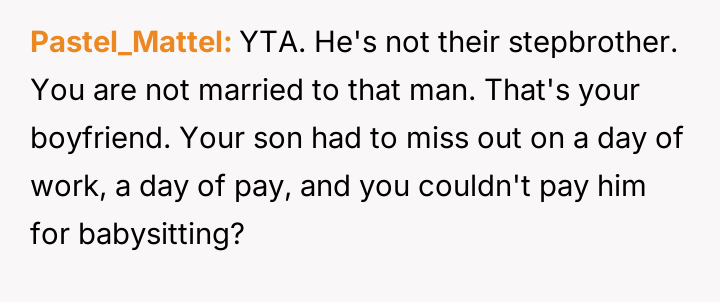 Was the mother correct in prioritizing the boyfriend's view that caring for step-siblings during a crisis is an unpaid family obligation, or should she have mediated to ensure her son's work time and financial loss were acknowledged, even if the request for payment was perceived as opportunistic?