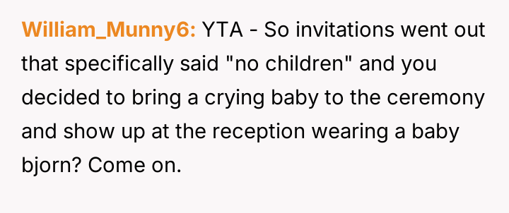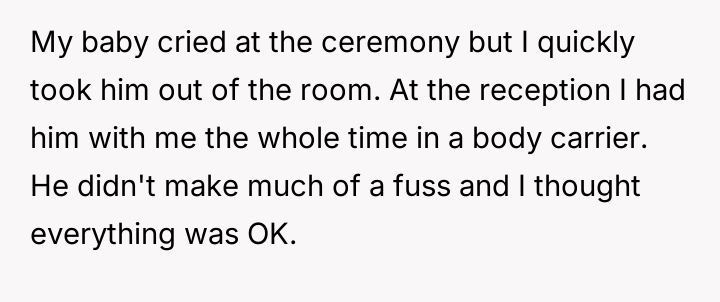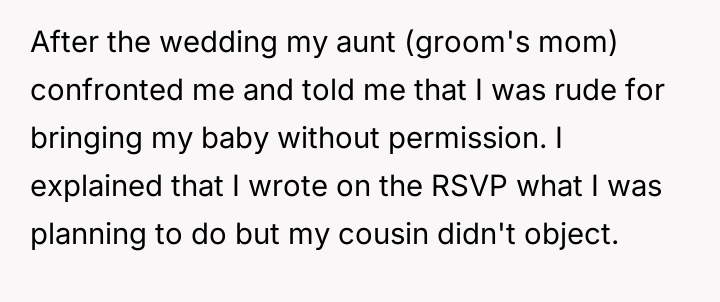 Despite communicating their plan to bring the baby, the OP's decision ultimately caused offense to the hosts, particularly the groom's mother, who viewed the action as disrespectful and a breach of established boundaries.