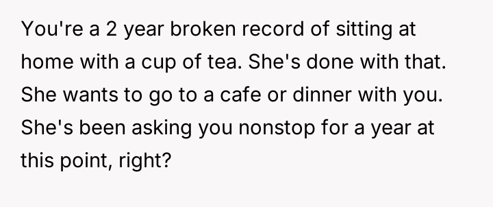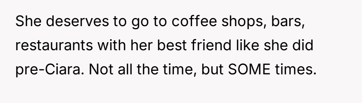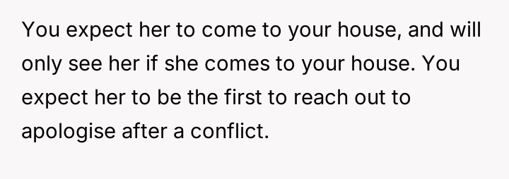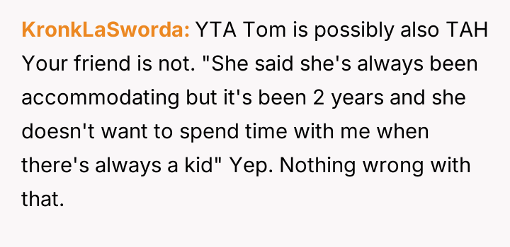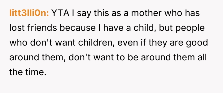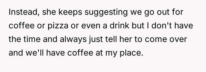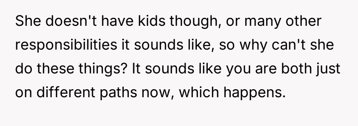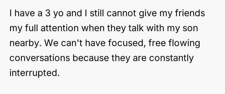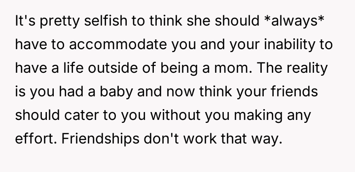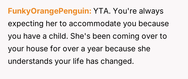 The debate rests on whose expectations regarding social time—the new mother's need for local, child-inclusive interaction or the child-free friend's need for familiar, child-free outings—should take precedence.