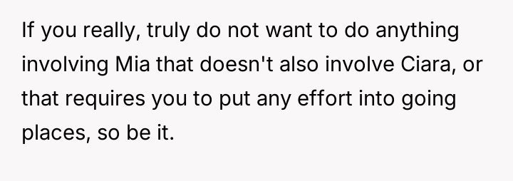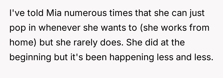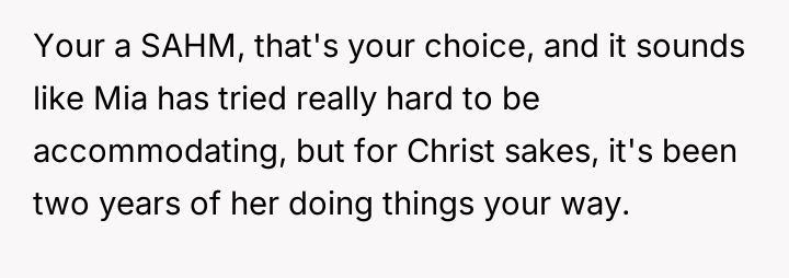 The central conflict stems from the OP's expectation that Mia should accommodate her new life as a stay-at-home mother by visiting the OP's home, while Mia appears to desire a return to their previous social routines that did not involve childcare responsibilities.