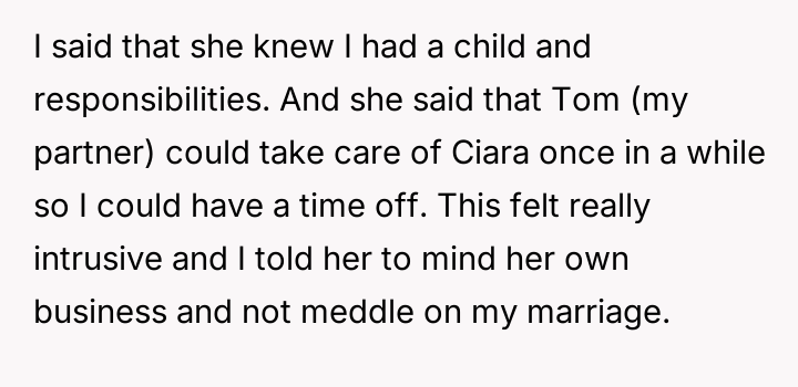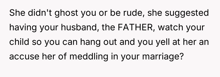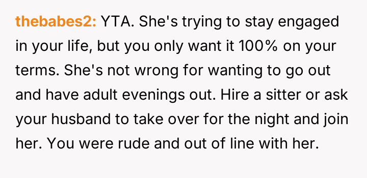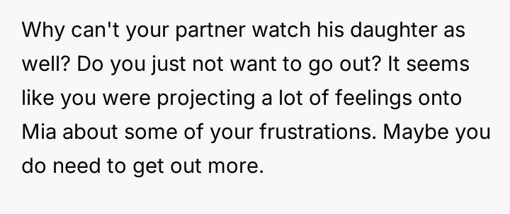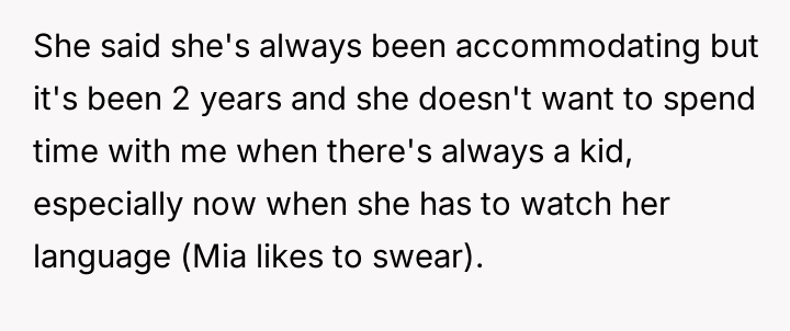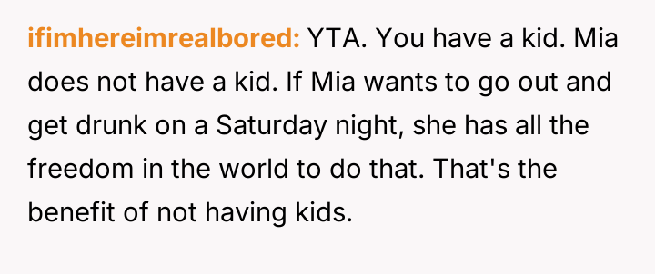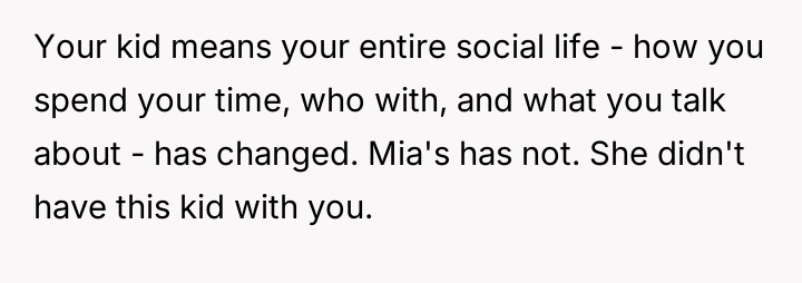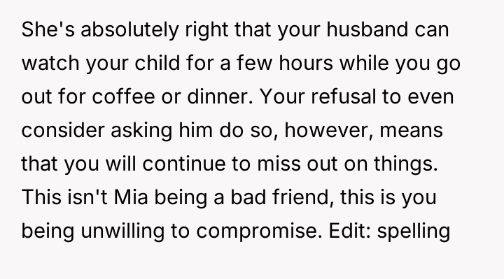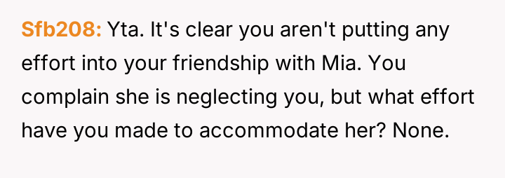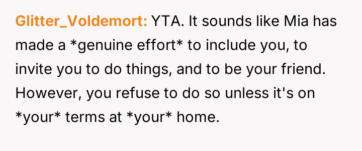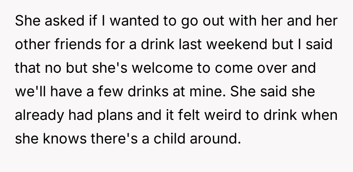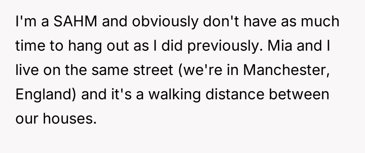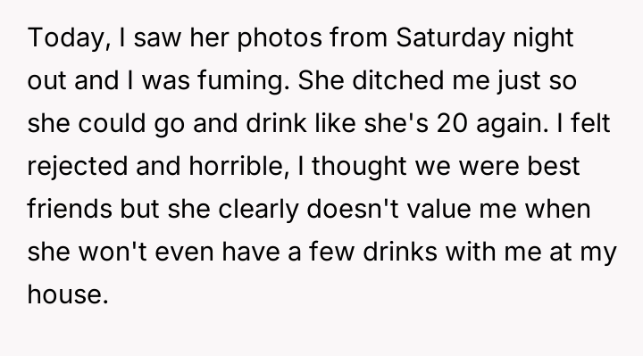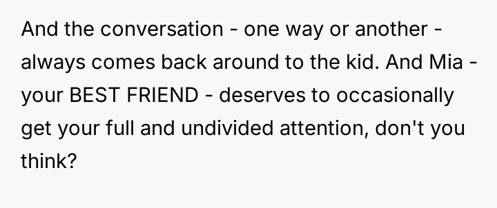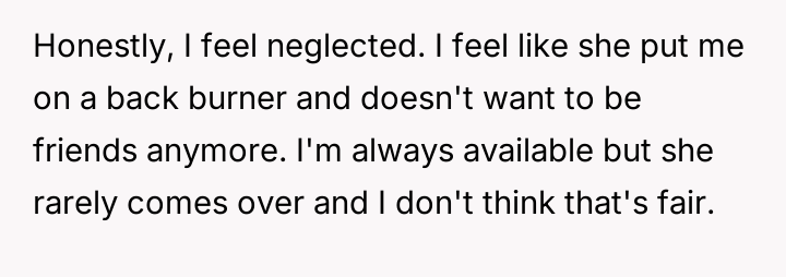 The original poster (OP) is feeling neglected and rejected by her best friend, Mia, because Mia consistently prioritizes socializing outside the home, away from the OP's child.
