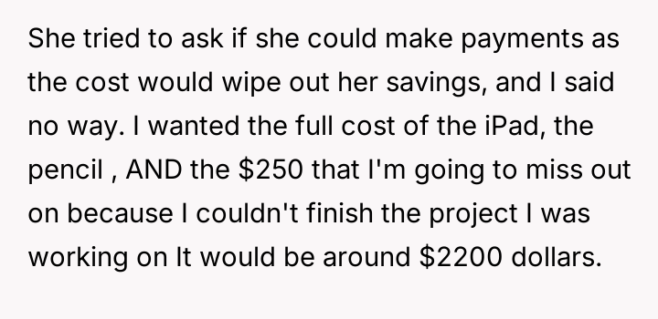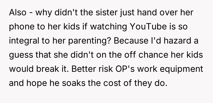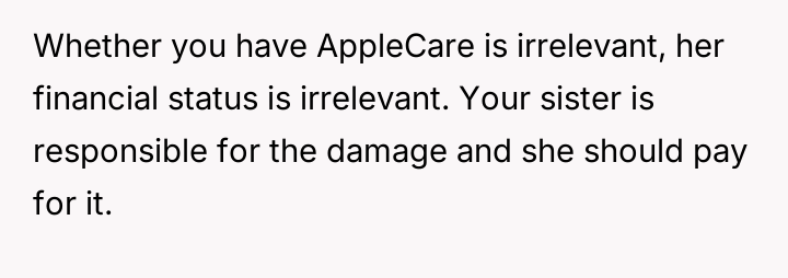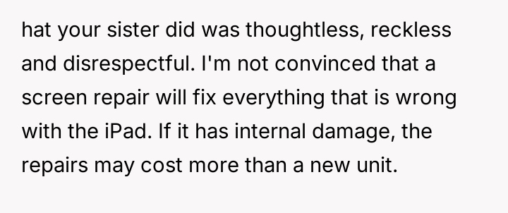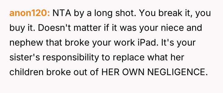 The original poster (OP) is facing significant financial loss and frustration due to their sister's negligence in supervising her children, who broke an expensive, work-essential iPad.