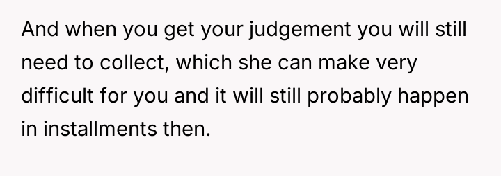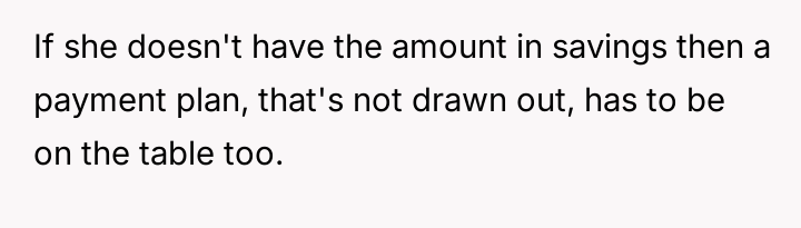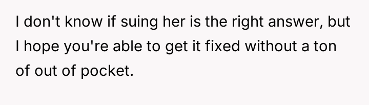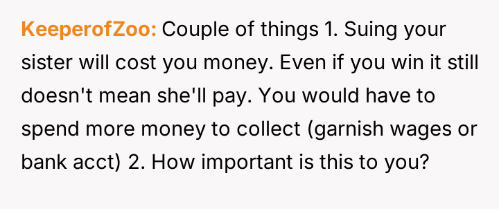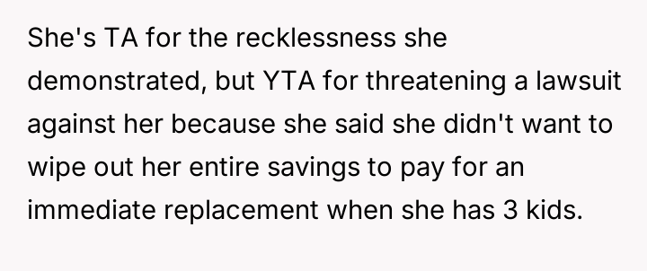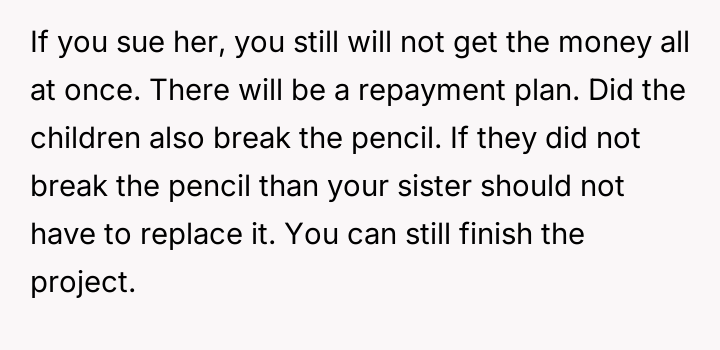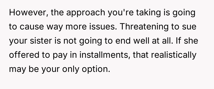Is the OP justified in pursuing legal action for the full replacement cost and lost income when the damage was caused by the sister's direct negligence, or is the expectation of immediate, full repayment unreasonable given the sister's current financial constraints?