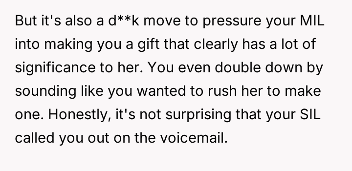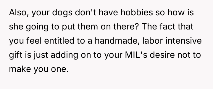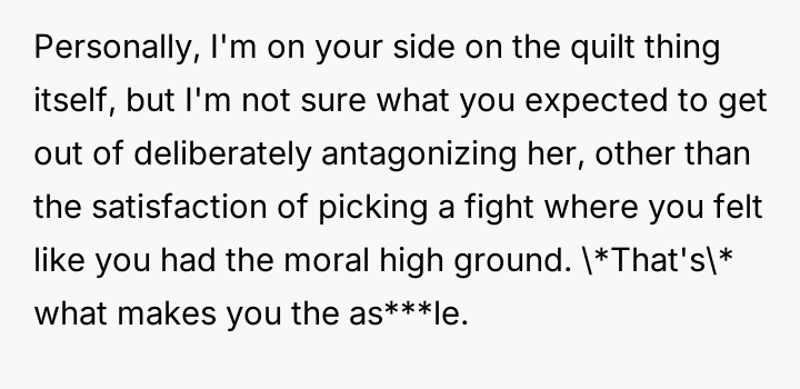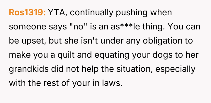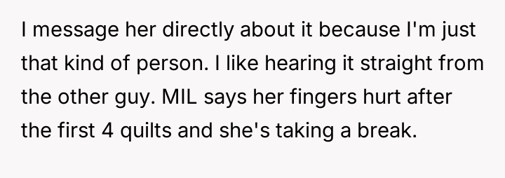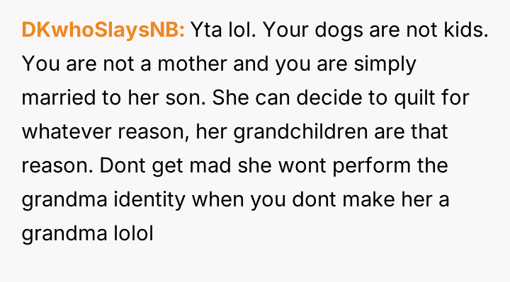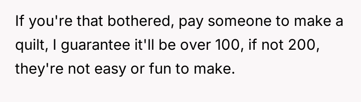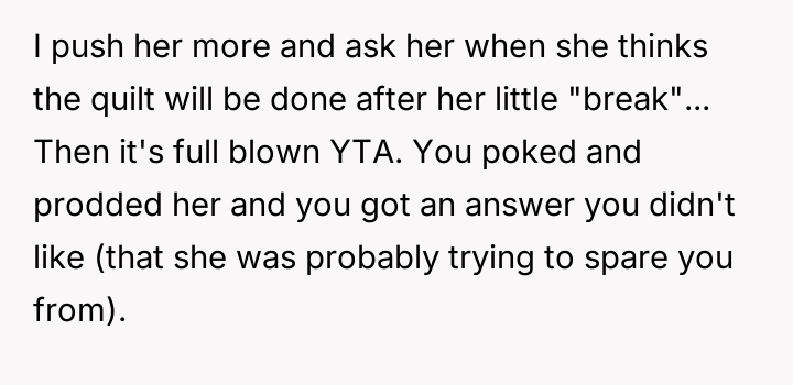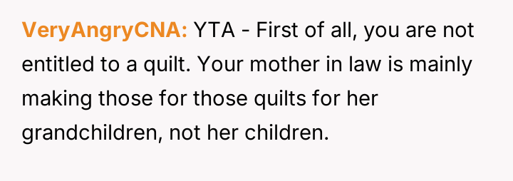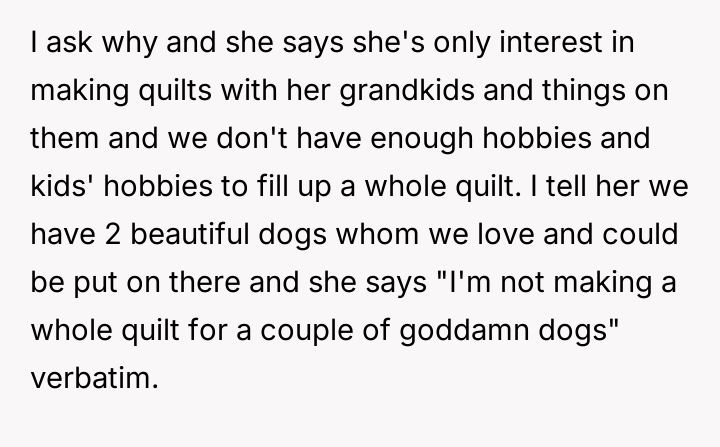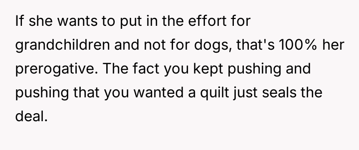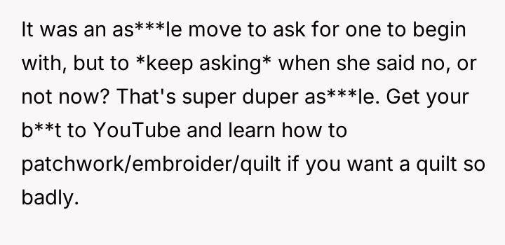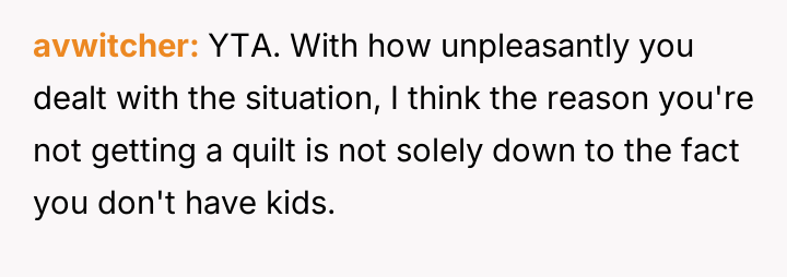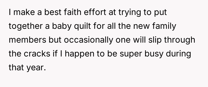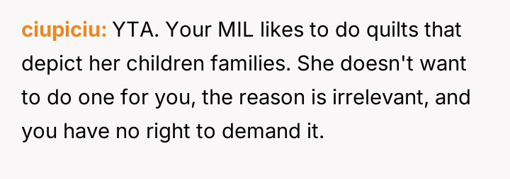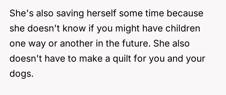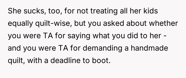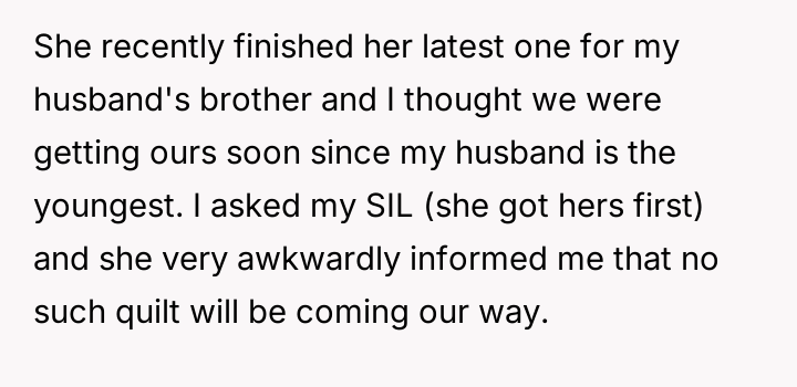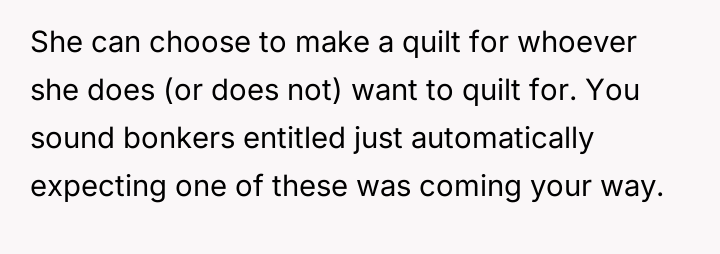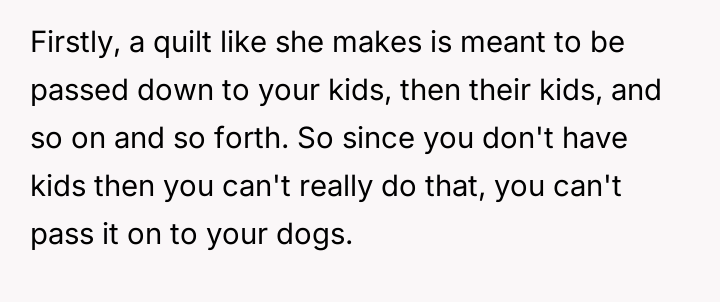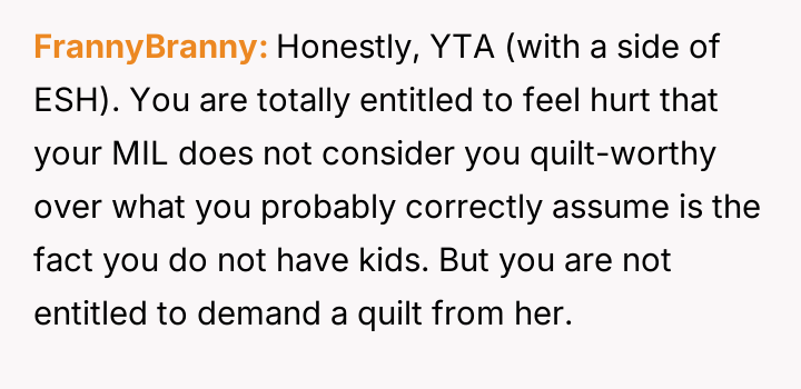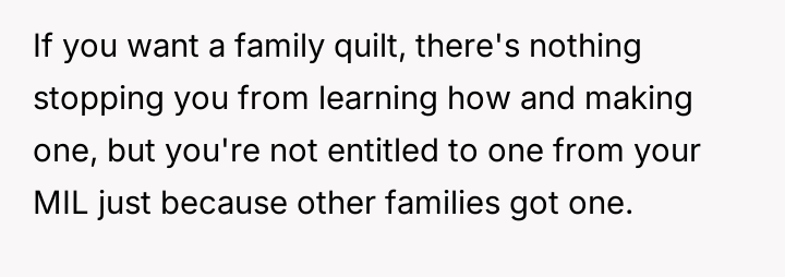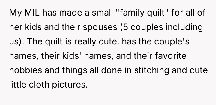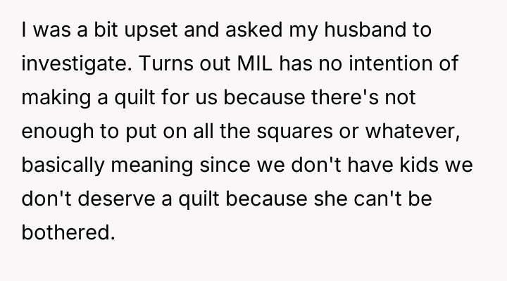AITA for being upset my MIL won't make a "family quilt" for me and my husband because we have no kids?