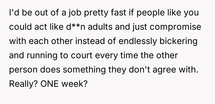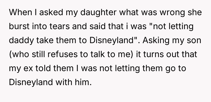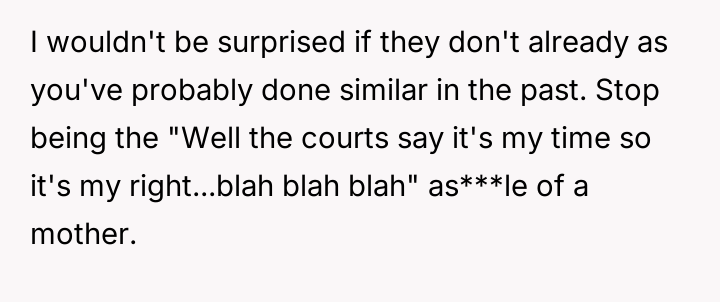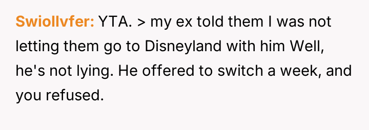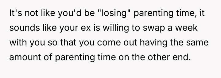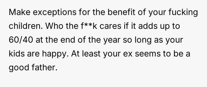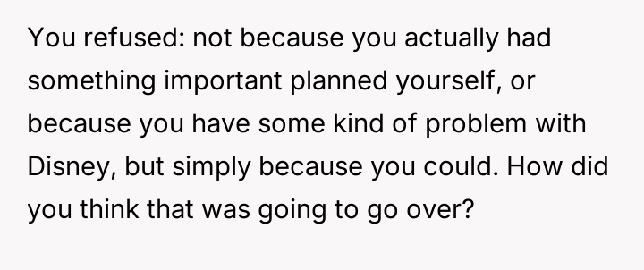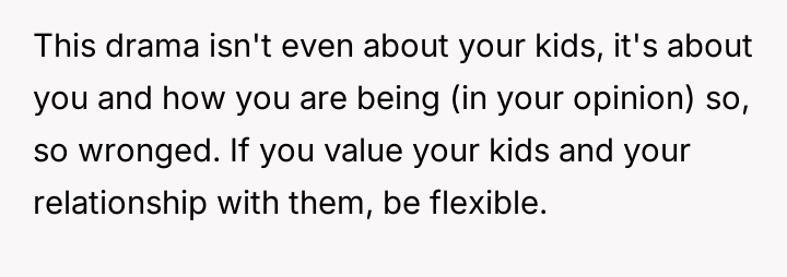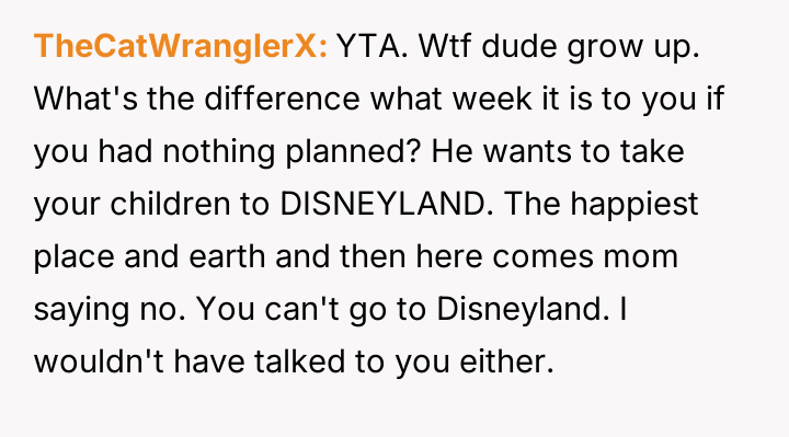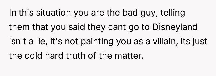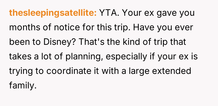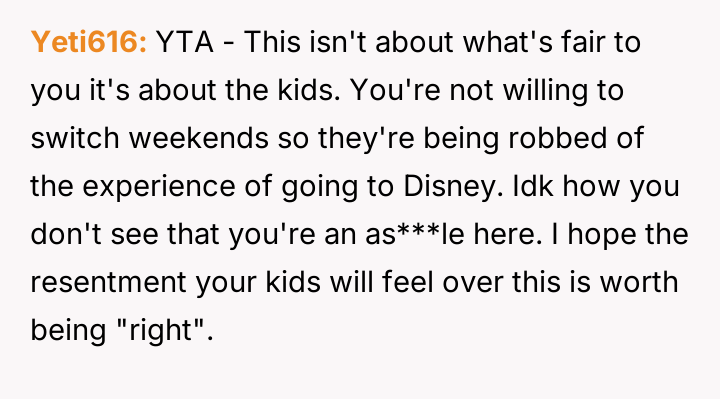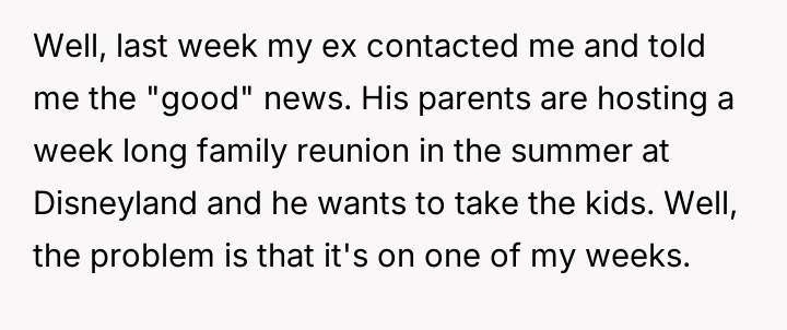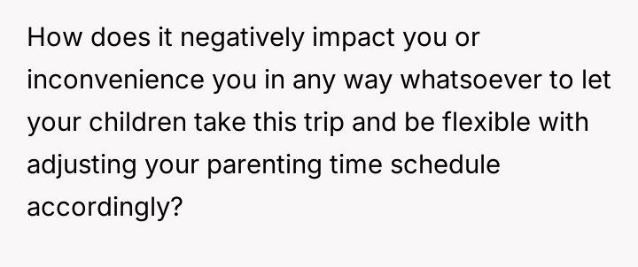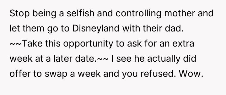 Given the established history of honoring scheduled time, is the parent justified in refusing to yield their appointed time for the Disneyland trip, or does the importance of the family event warrant a temporary compromise despite the ex-partner's manipulative communication?