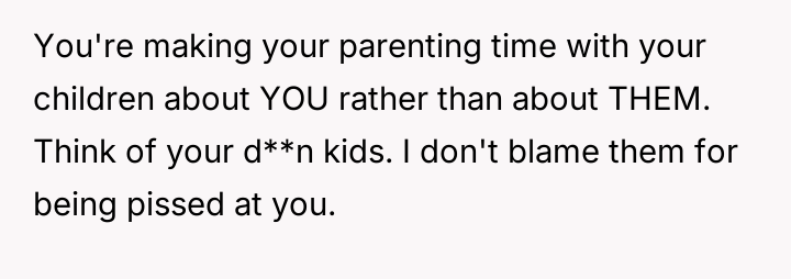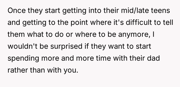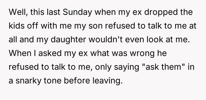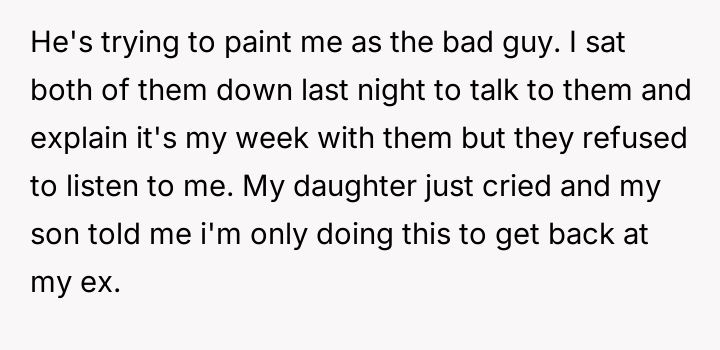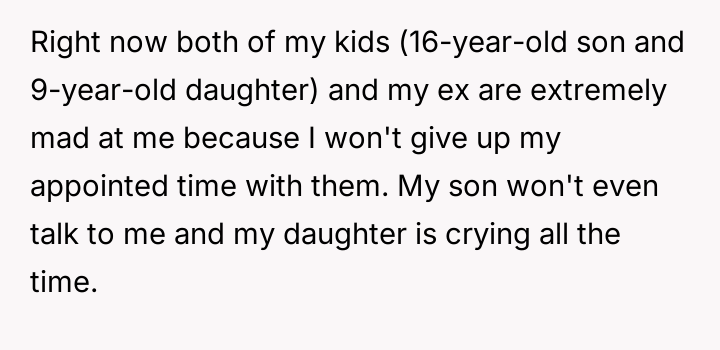 The parent is currently facing significant emotional distress from both children, who are angry because the parent is upholding the established custody schedule.