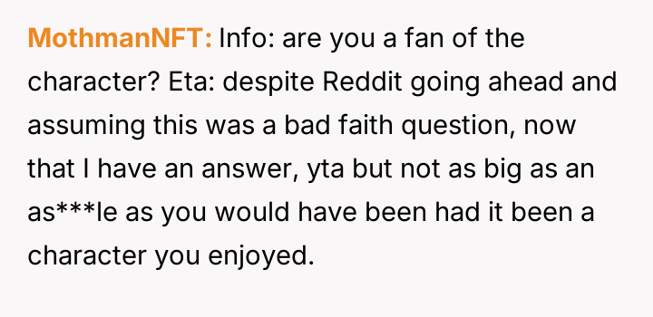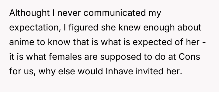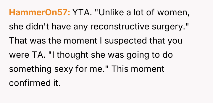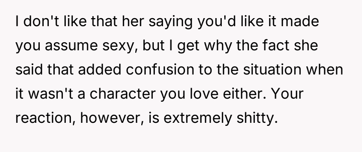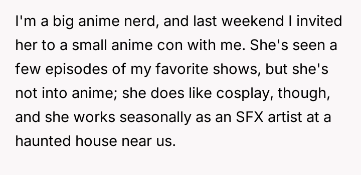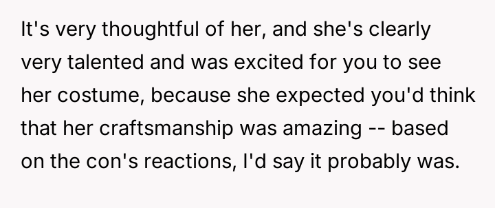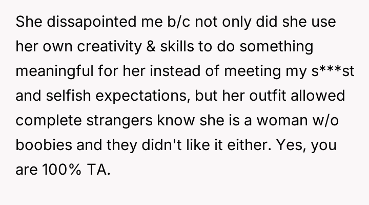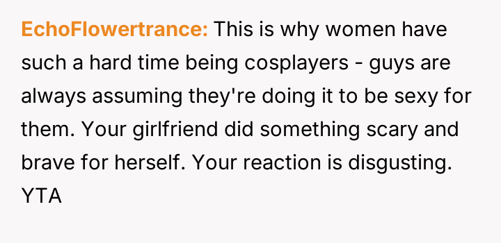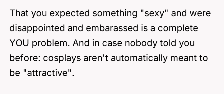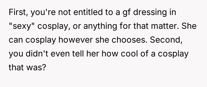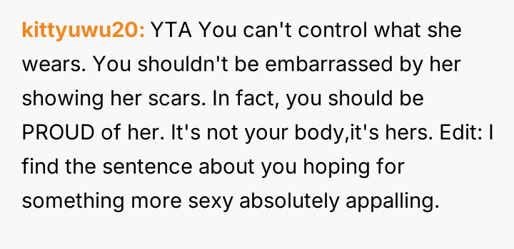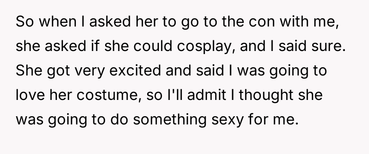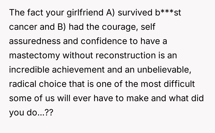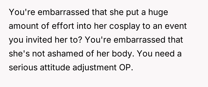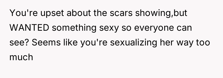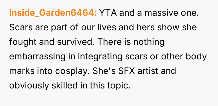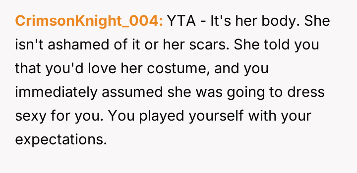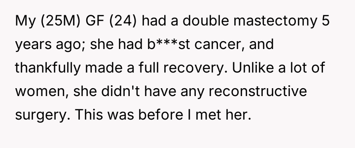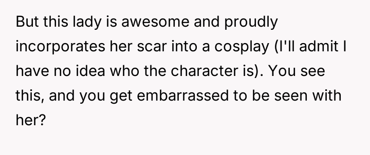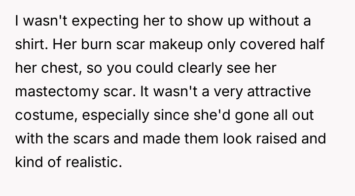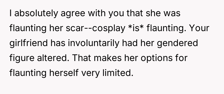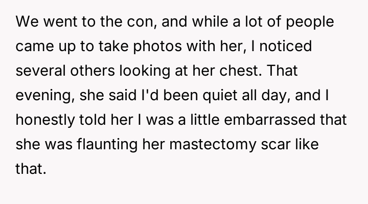 The original poster (OP) experienced embarrassment and surprise when his girlfriend chose a cosplay that prominently displayed her mastectomy scars, conflicting with his expectation of a conventionally attractive costume.