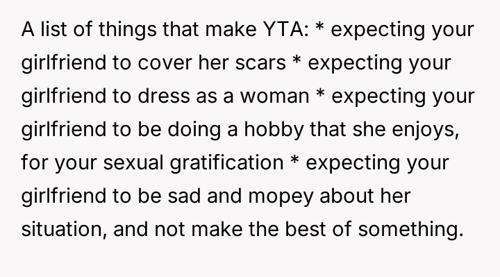 The core question is whether the OP was justified in prioritizing his personal comfort and aesthetic expectations over his girlfriend's emotionally significant choice to display her scars through cosplay, or if his reaction was an insensitive judgment on her past trauma and body.