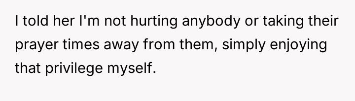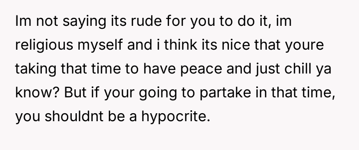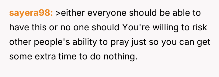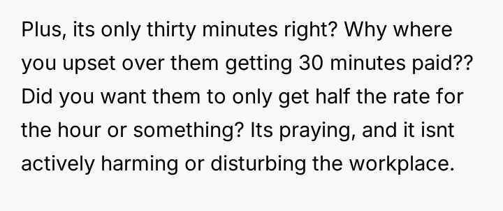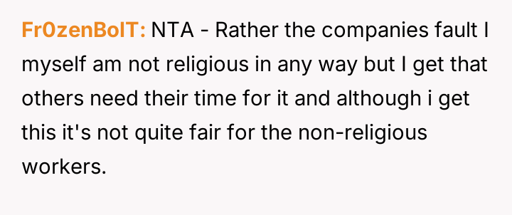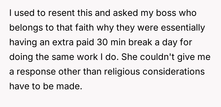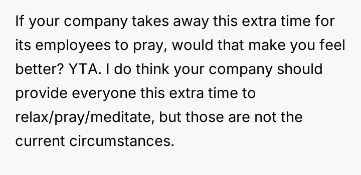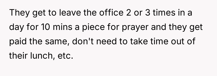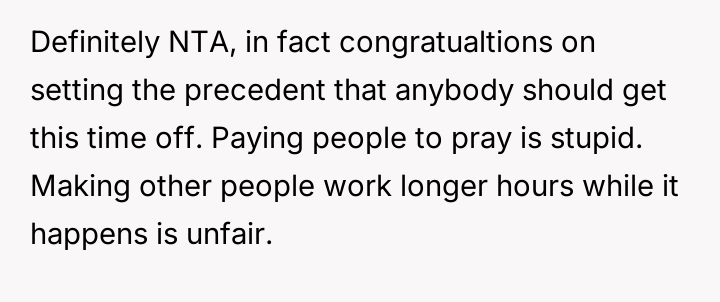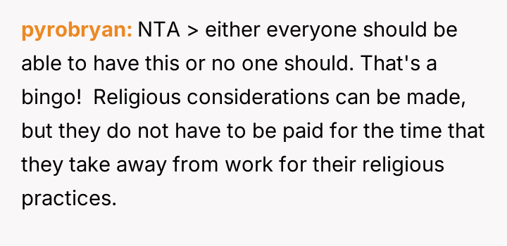 The original poster (OP) feels justified in seeking equal treatment regarding paid time off for personal reflection, directly challenging a workplace accommodation based on religious belief.