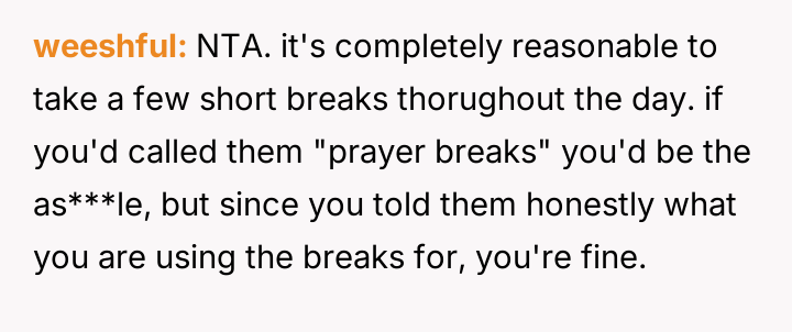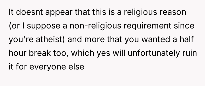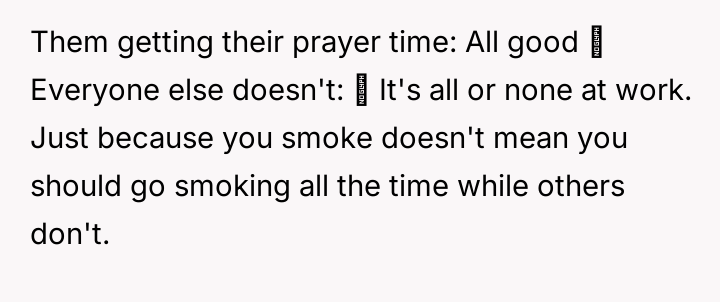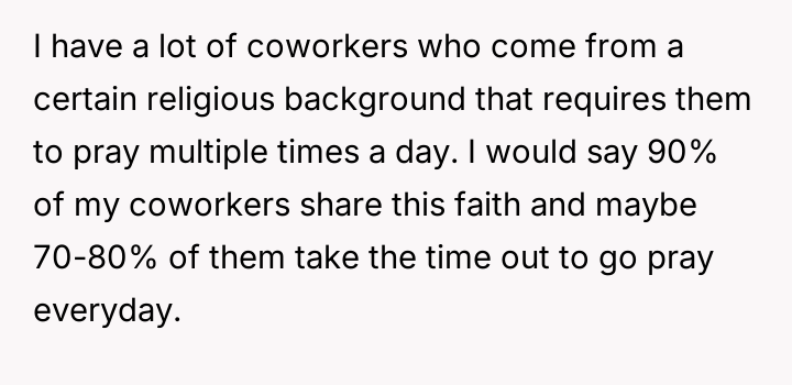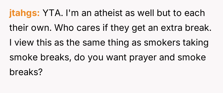 AITA for requesting prayer breaks at work because my religious coworkers do even though I’m not religious?