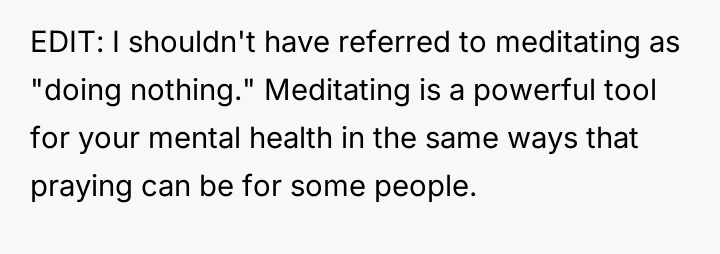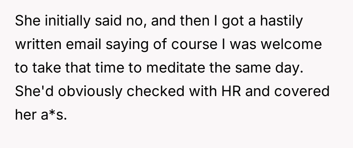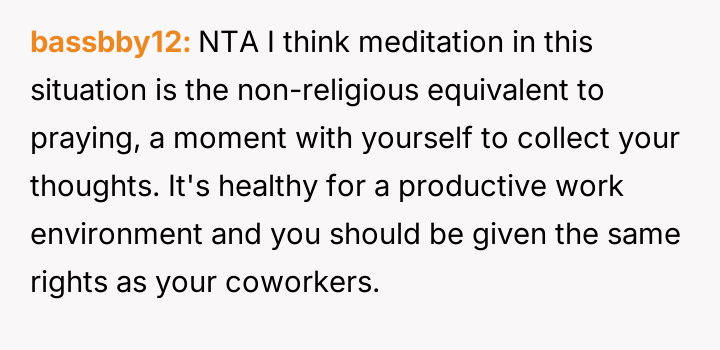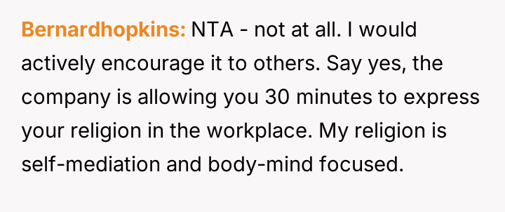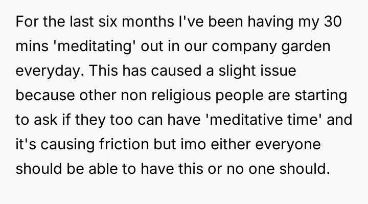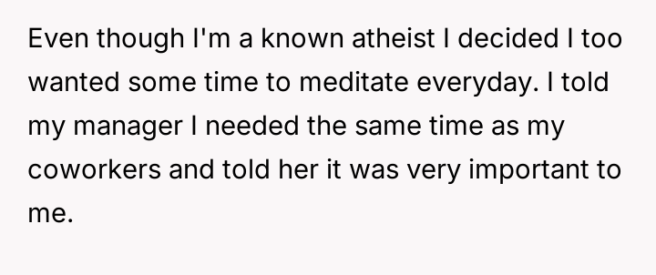Given the established precedent of paid time off for religious practice, is the OP correct in demanding equal time for secular meditation, or is this an attempt to undermine a protected religious accommodation by forcing a change in workplace culture?