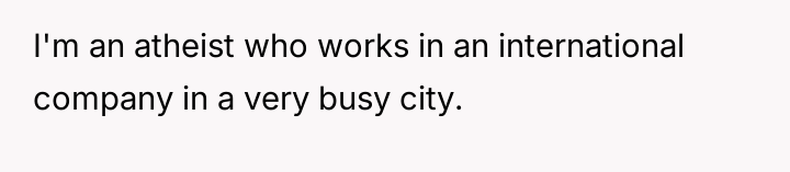 In a bustling international company where faith and work intertwine, one atheist stands quietly on the sidelines, watching as the majority of coworkers step away multiple times a day to fulfill their religious duties.